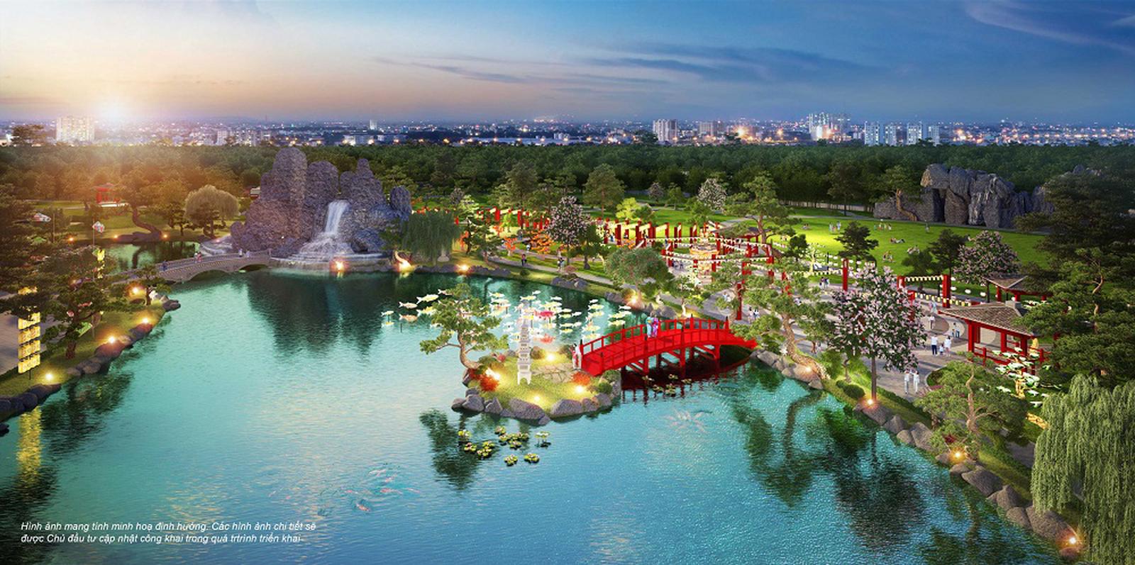 Công trình có diện tích hơn 6 ha, được kiến tạo theo mô hình Vườn Nhật truyền thống với đầy đủ các hạng mục gồm: quảng trường, cầu gỗ đỏ, suối và hồ cá chép đỏ, vườn thiền, công viên đèn lồng, chòi gỗ, khu rừng tre trúc, núi giả, thác nước, nhà hàng Nhật …