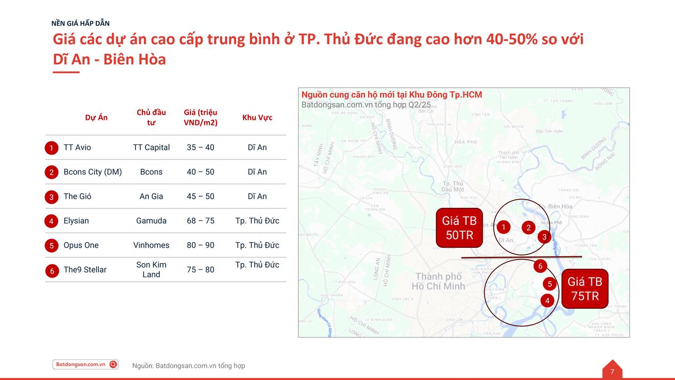 Tại TP Thủ Đức (cũ), các dự án như Elysian, The Opus One (Vinhomes Grand Park) hay The 9 Stellars đã thiết lập mặt bằng giá trung bình từ 70-90 triệu đồng/m², phản ánh chu kỳ tăng giá mạnh mẽ sau đề án thành lập thành phố. Trong khi đó, tại khu vực Dĩ An (cũ), các dự án như TT Avio, Bcons City, The Gió Riverside vẫn dao động ở mức 35-50 triệu đồng/m², tức thấp hơn 40-50% so với Thủ Đức.