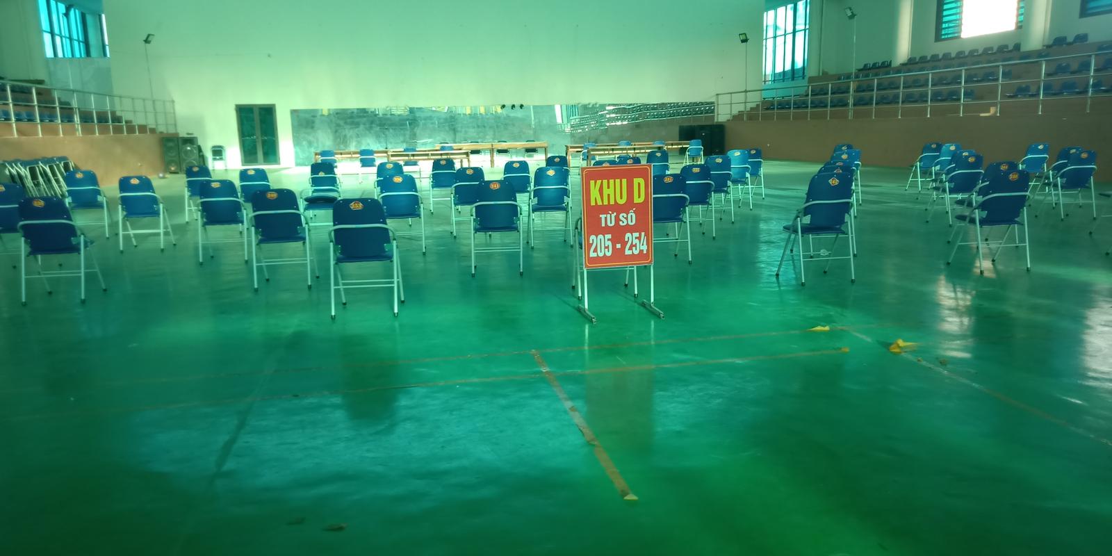 Nhà Thi đấu thể dục thể thao huyện được bố trí để thực hiện các phiên đấu giá quyền sử dụng đất đảm bảo an toàn dịch COVID -19. Ảnh: Văn Thanh