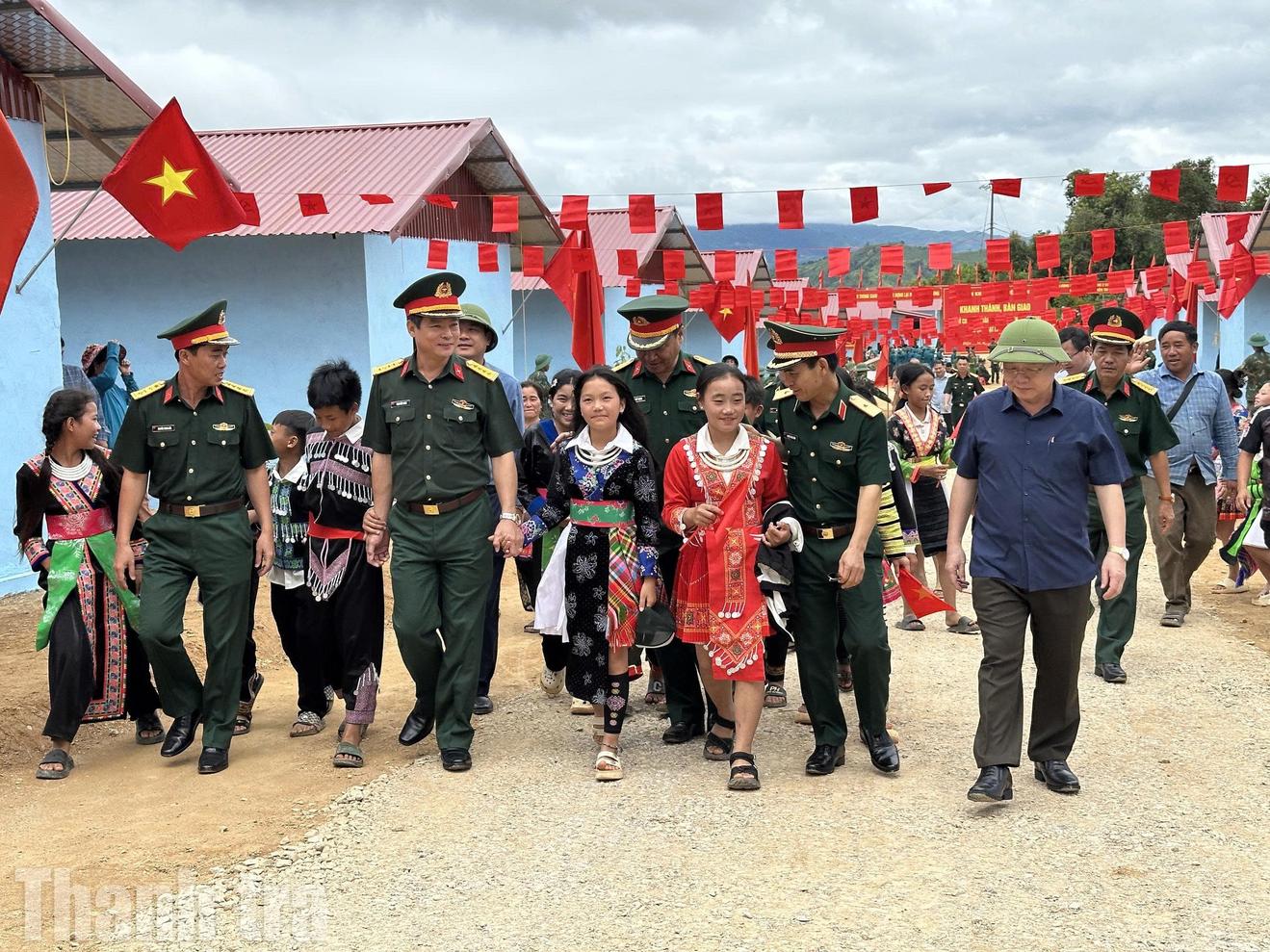Lãnh đạo tỉnh Điện Biên và cán bộ, chiến sĩ cùng Nhân dân bản Háng Pu Xi, xã Xa Dung trong niềm vui an cư, dựng lại mái ấm quê hương sau mưa lũ. Ảnh: PV