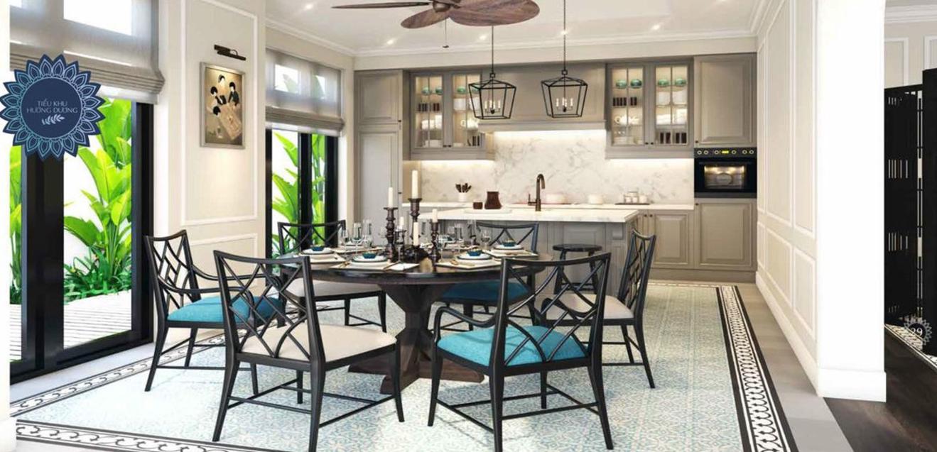 Thiết kế phòng bếp tràn ngập ánh nắng và nhìn ra khoảnh sân vườn xanh mát của tiểu khu Hướng Dương tại Vinhomes Riverside – The Harmony