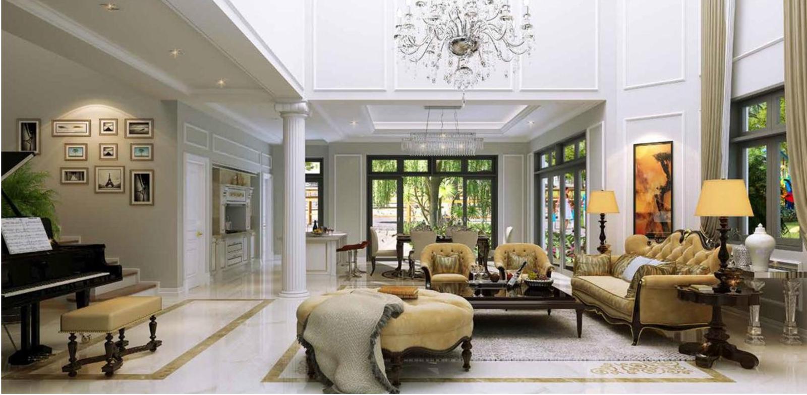 Thiết kế phòng khách sang trọng theo phong cách tân cổ điển với không gian mở, nhiều cửa sổ hướng ra không gian xanh bên ngoài tại Vinhomes Riverside – The Harmony