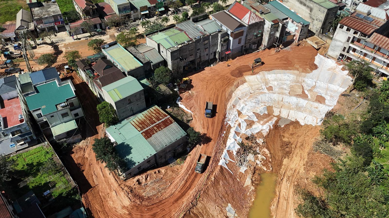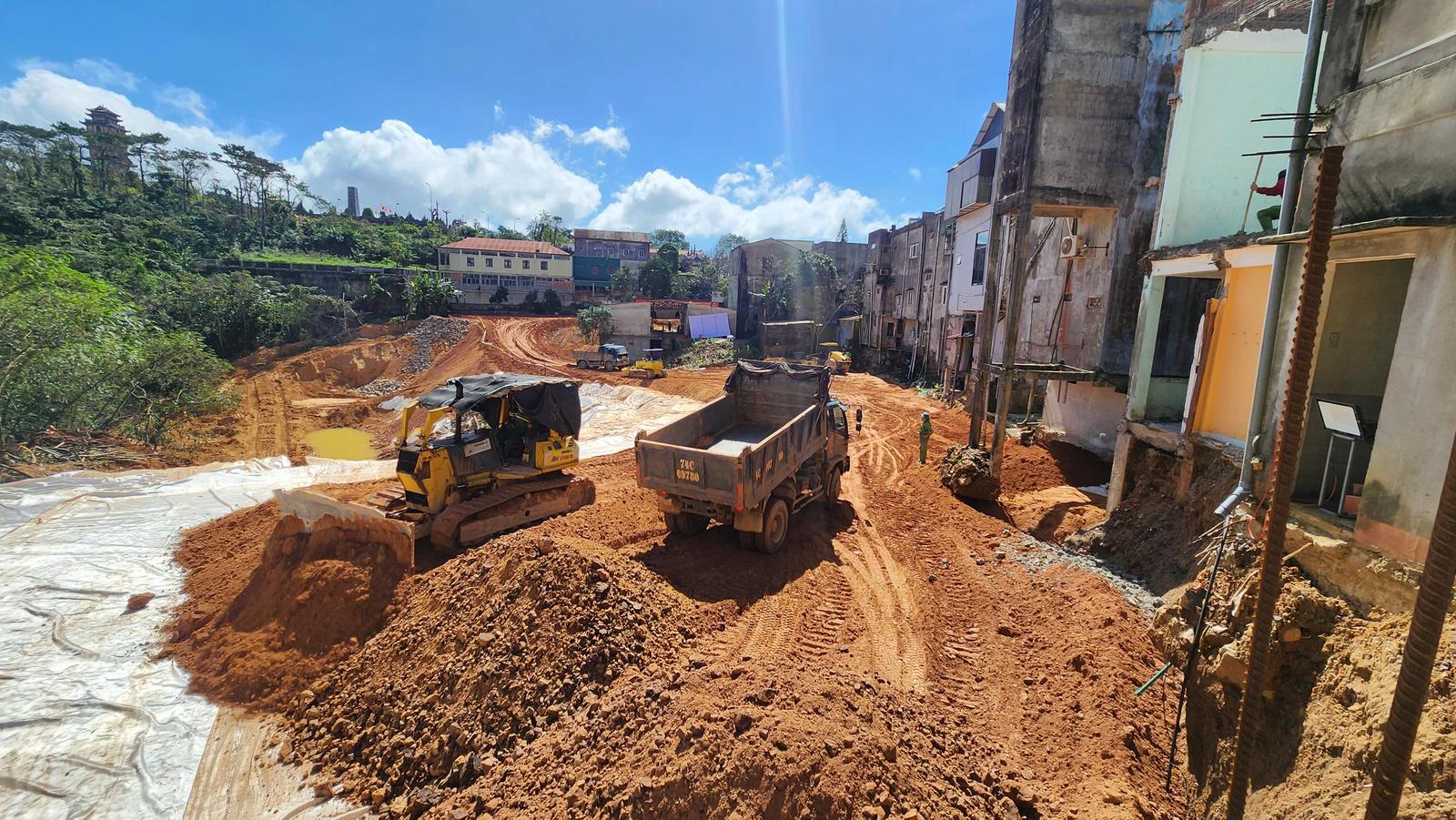 Máy móc, lực lượng thi công hoạt động liên tục từ sáng sớm đến nửa đêm, hàng chục nghìn mét khối đất đá được huy động để gia cố khu vực sạt lở. Ảnh: Minh Tân