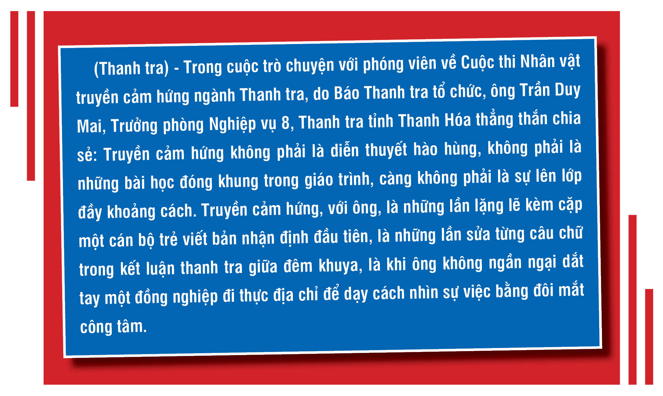 Trong ngành Thanh tra - nơi đòi hỏi sự tỉnh táo, liêm chính và thấu cảm, ông Trần Duy Mai chính là một người giữ lửa. Ngọn lửa ấy không rực rỡ phô trương, nhưng âm ỉ bền bỉ, lan tỏa đến từng đồng nghiệp, từng cán bộ trẻ đang chập chững vào nghề.