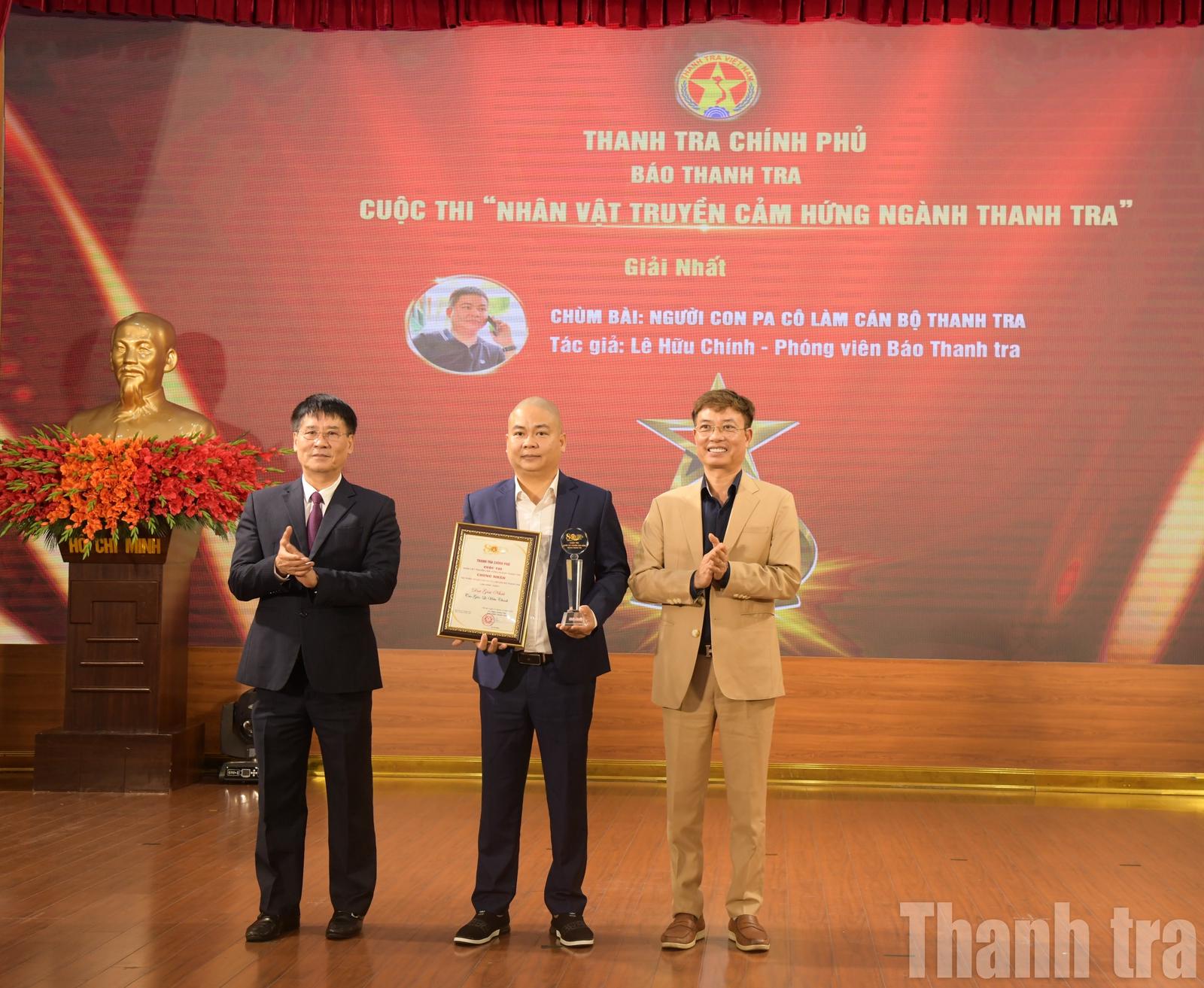 Phó Tổng Thanh tra Lê Sỹ Bảy và Tổng Biên tập Báo Thanh tra Nguyễn Tuấn Anh trao giải Nhất cho anh Lê Hữu Chính với tác phẩm "Người con Pa Cô làm cán bộ thanh tra". Ảnh: Huy Trần