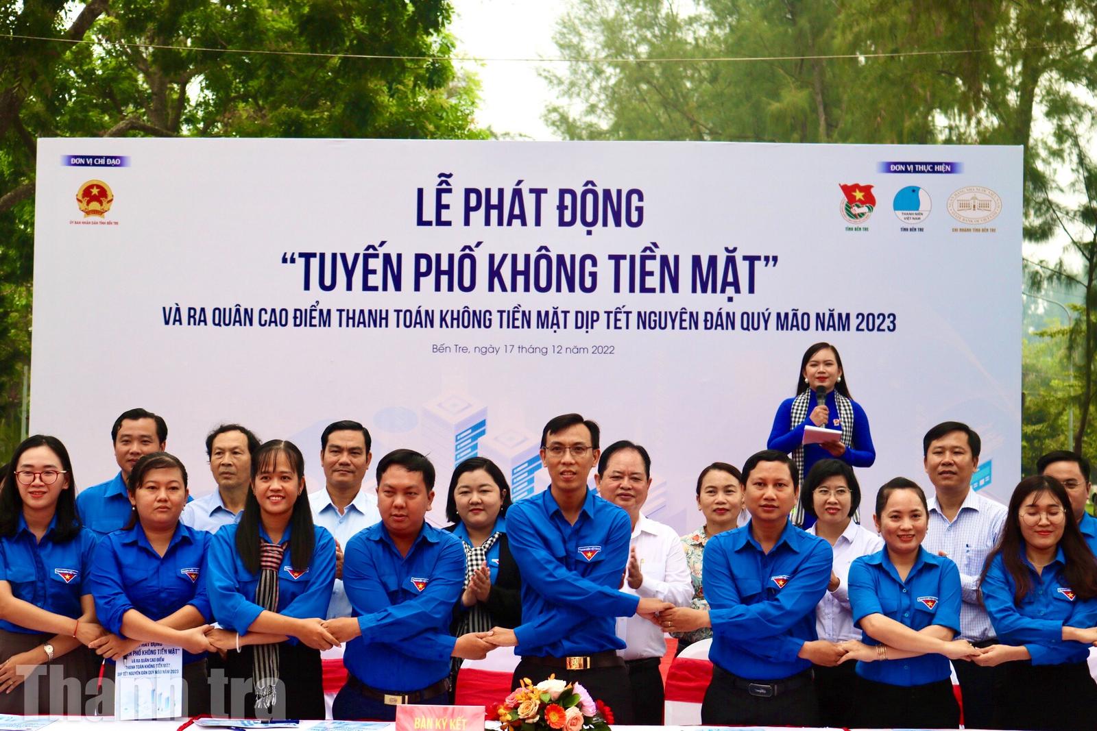 Năm 2022, chị Bùi Thị Thuý Hằng cùng đồng nghiệp ra quân tuyên truyền chiến dịch "tuyến phố không tiền mặt". Ảnh NVCC