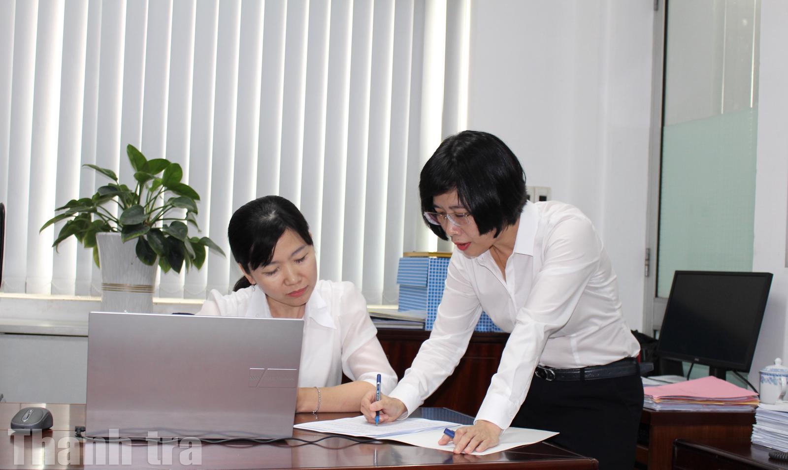 Bùi Thị Thuý Hằng (người đứng), Chánh Thanh tra Ngân hàng Nhà nước Chi nhánh khu vực 13 đang trao đổi công việc cùng đồng nghiệp. Ảnh: Minh Nghĩa