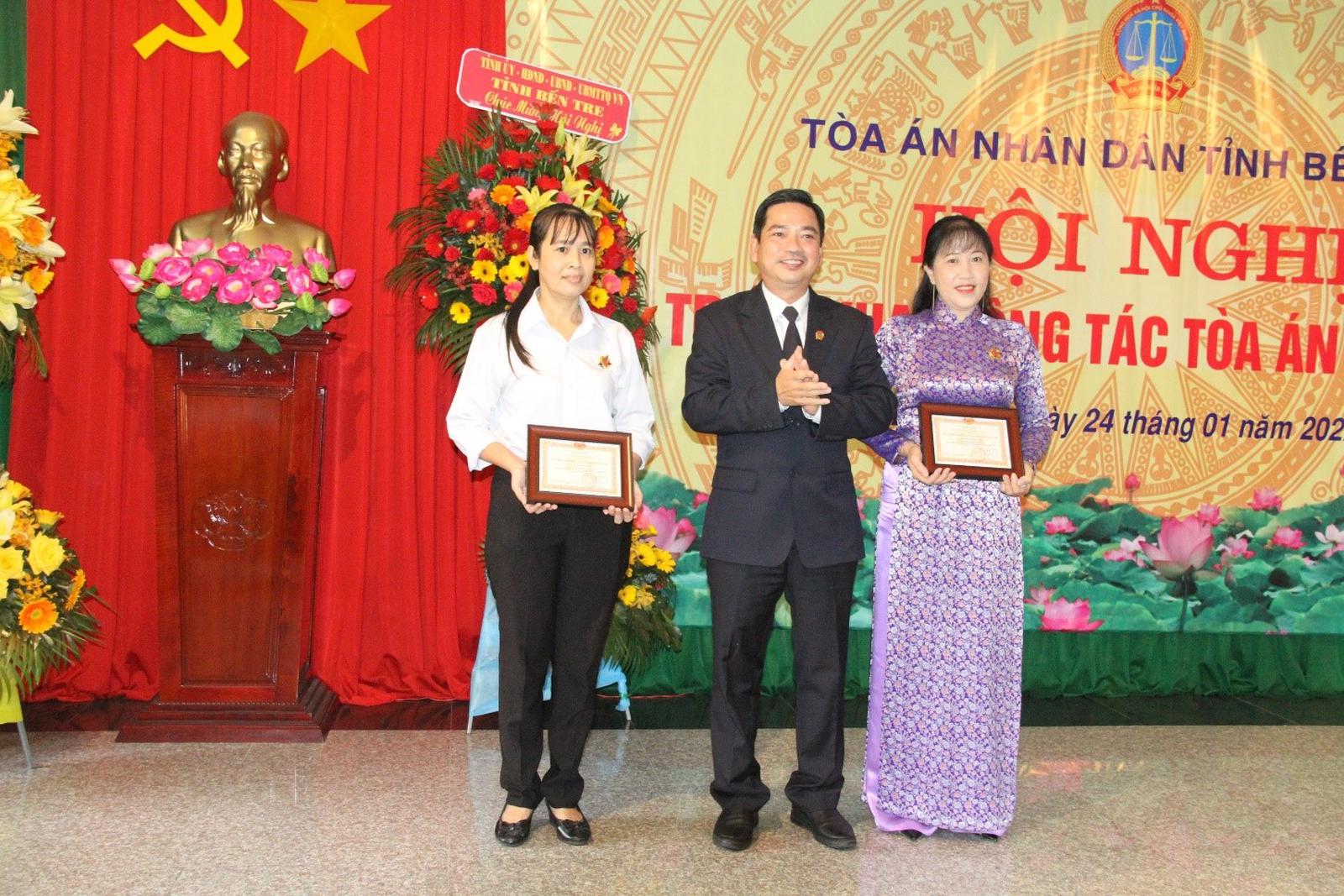 Chị Dương Thị Hồng Thuỳ (bên trái) nhận kỷ niệm chương “Vì sự nghiệp Toà án”. Ảnh: Huỳnh Như