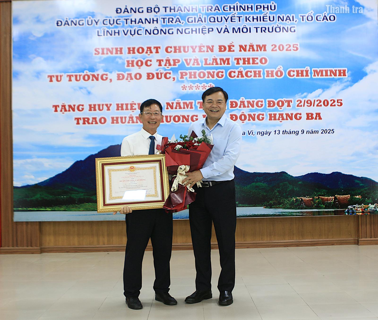 Ông Dương Quốc Huy, Phó Bí thư Đảng ủy, Phó Tổng Thanh tra Chính phủ, trao Huy hiệu 40 năm tuổi Đảng cho ông Đào Văn Thanh. Ảnh: Hoàng Nam