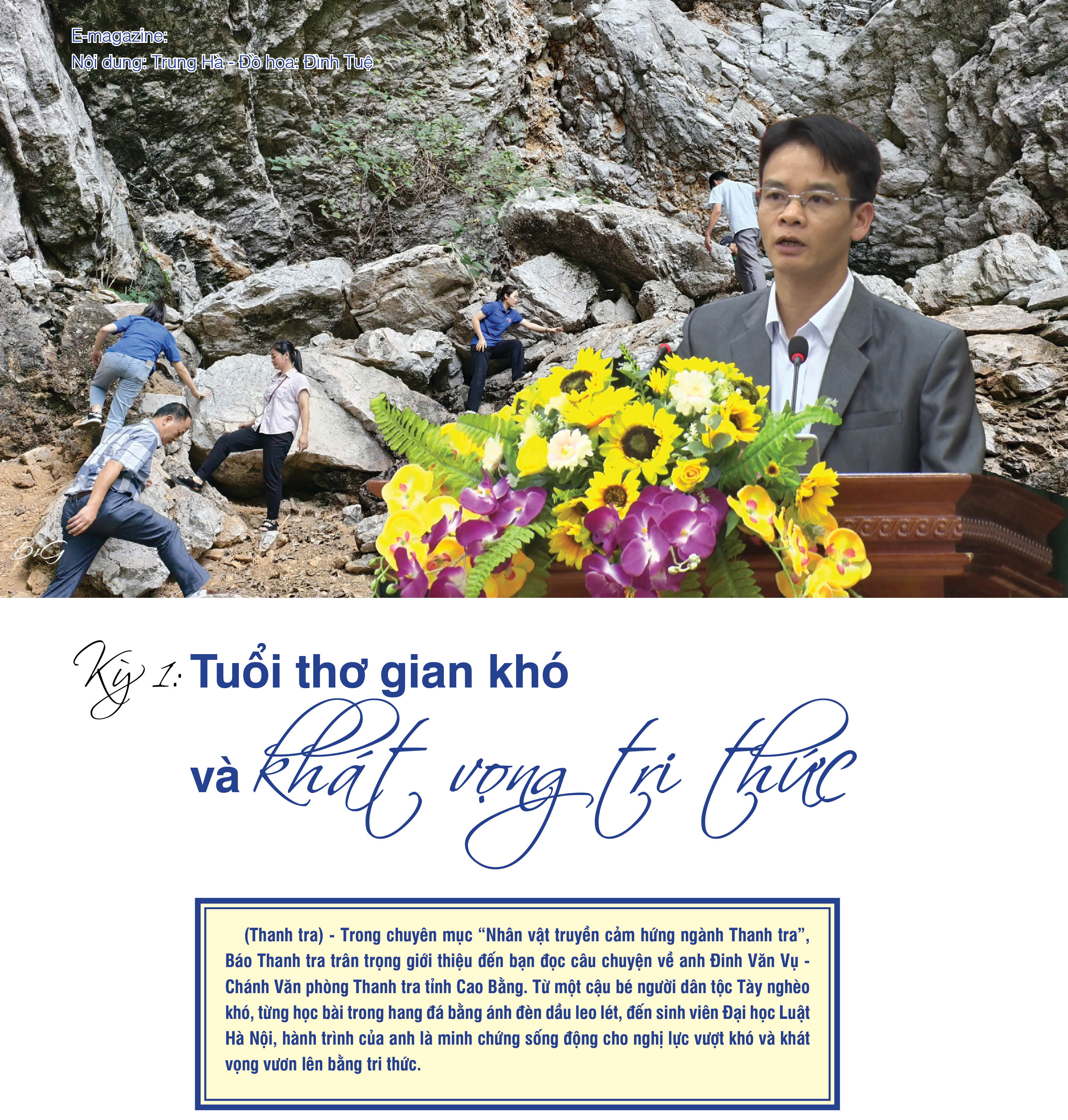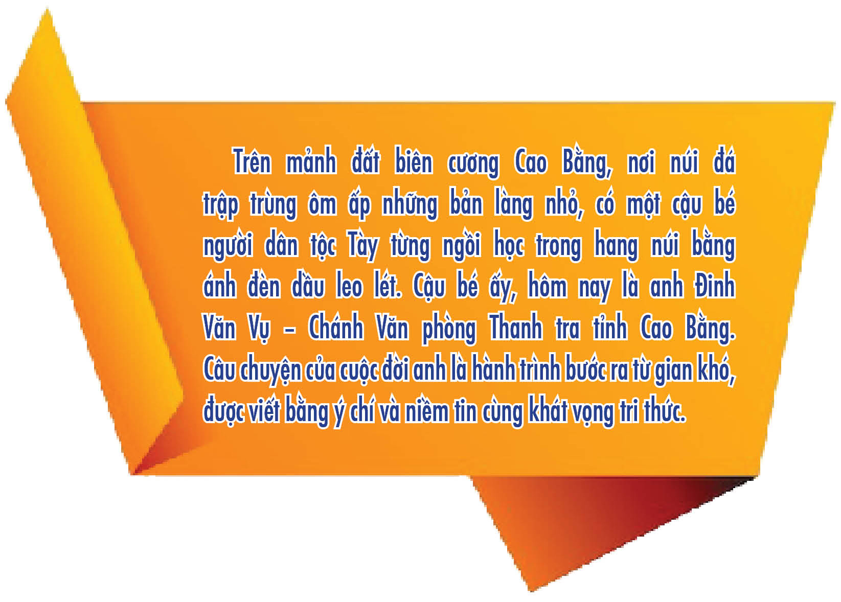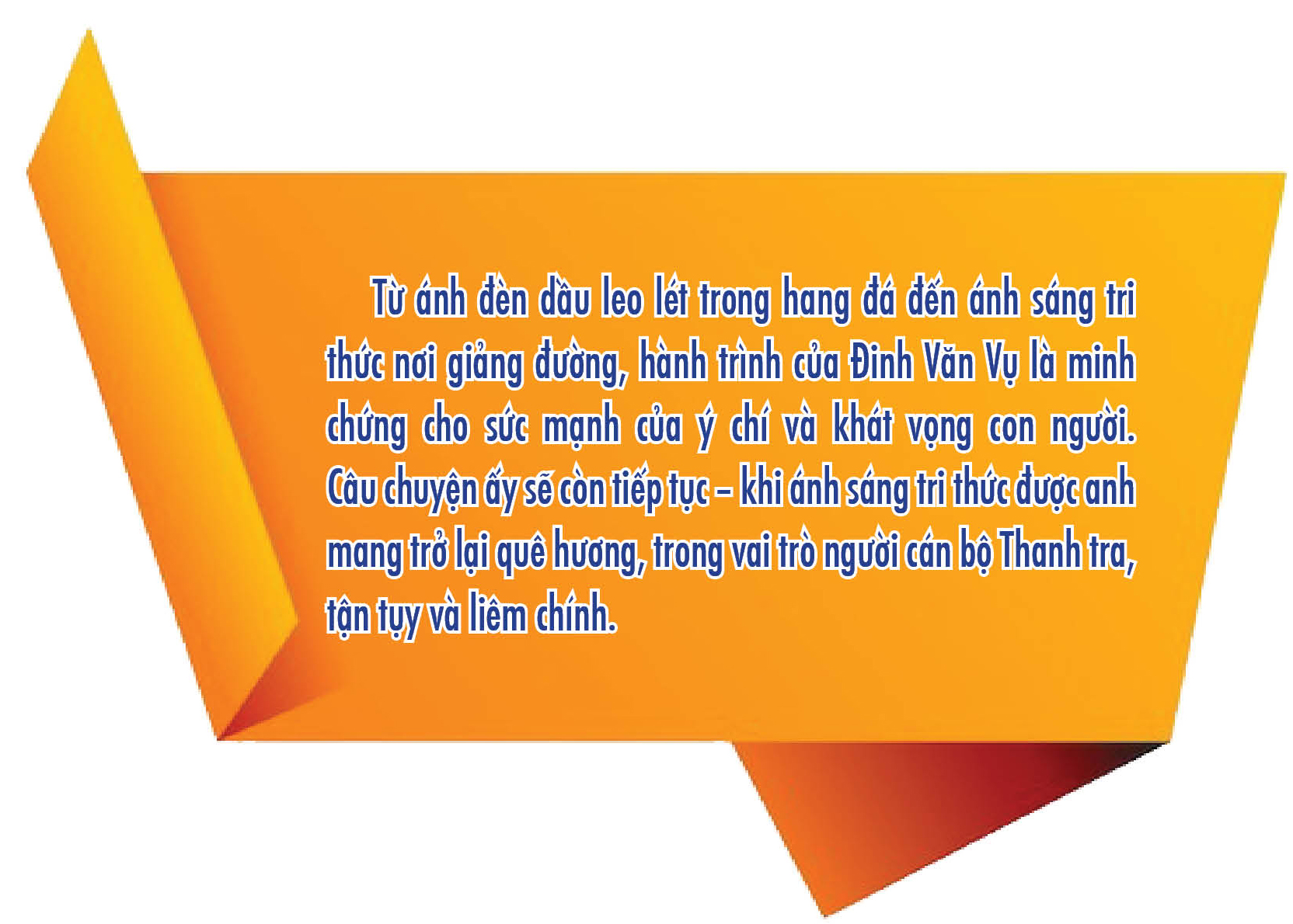 Không có bàn ghế tử tế, anh dùng tấm ván gỗ kê lên gạch làm chỗ viết. Không có điện, ánh sáng duy nhất để học bài là ngọn đèn dầu leo lét. Mùa hè oi bức, Đinh Văn Vụ tìm đến một hang đá gần nhà để học. Trong không gian tĩnh lặng, tiếng bút sột soạt hòa cùng tiếng gió, ánh đèn dầu lập lòe chiếu lên vách núi – ánh sáng nhỏ nhoi nhưng bền bỉ của niềm tin và tri thức.