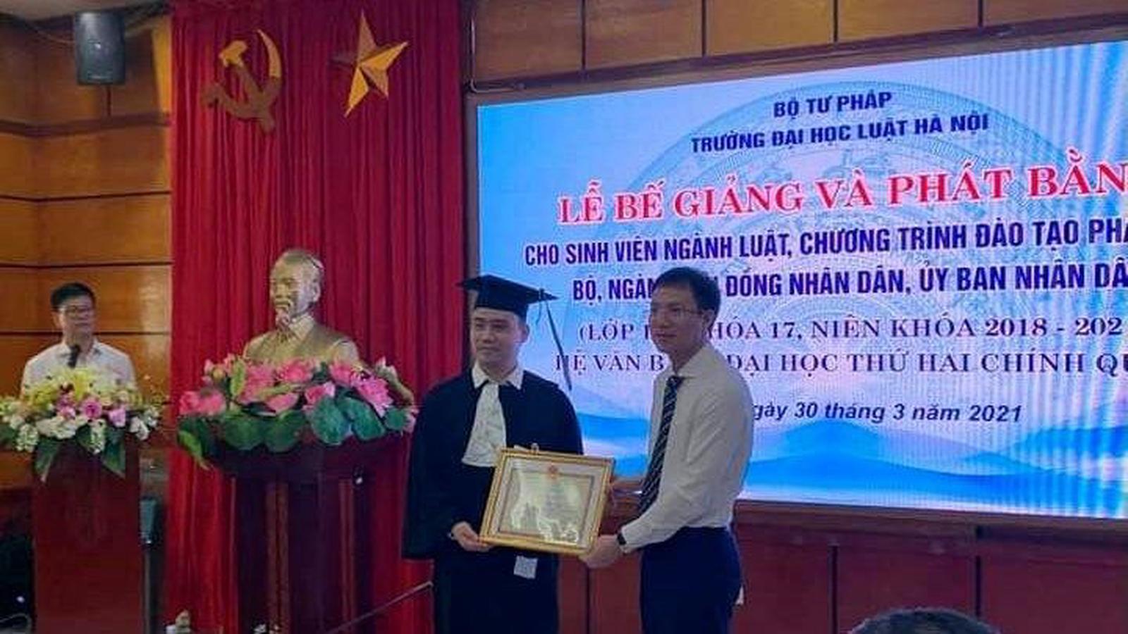Hiệu trưởng Trường Đại học Luật Hà Nội Đoàn Trung Kiên trao tặng giấy khen cho đồng chí Nguyễn Hữu Quý đã tốt nghiệp thủ khoa của ngành học năm 2021. Ảnh: NVCC