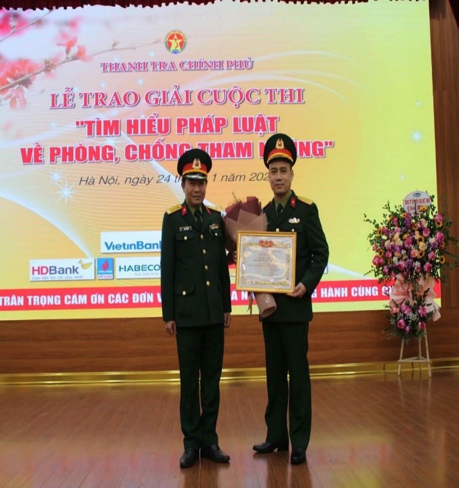 Tổng Thanh tra Chính phủ Đoàn Hồng Phong trao Giấy chứng nhận đoạt giải Nhất Cuộc thi “Tìm hiểu pháp luật về phòng, chống tham nhũng” cho ông Nguyễn Hữu Quý. Ảnh: QĐND