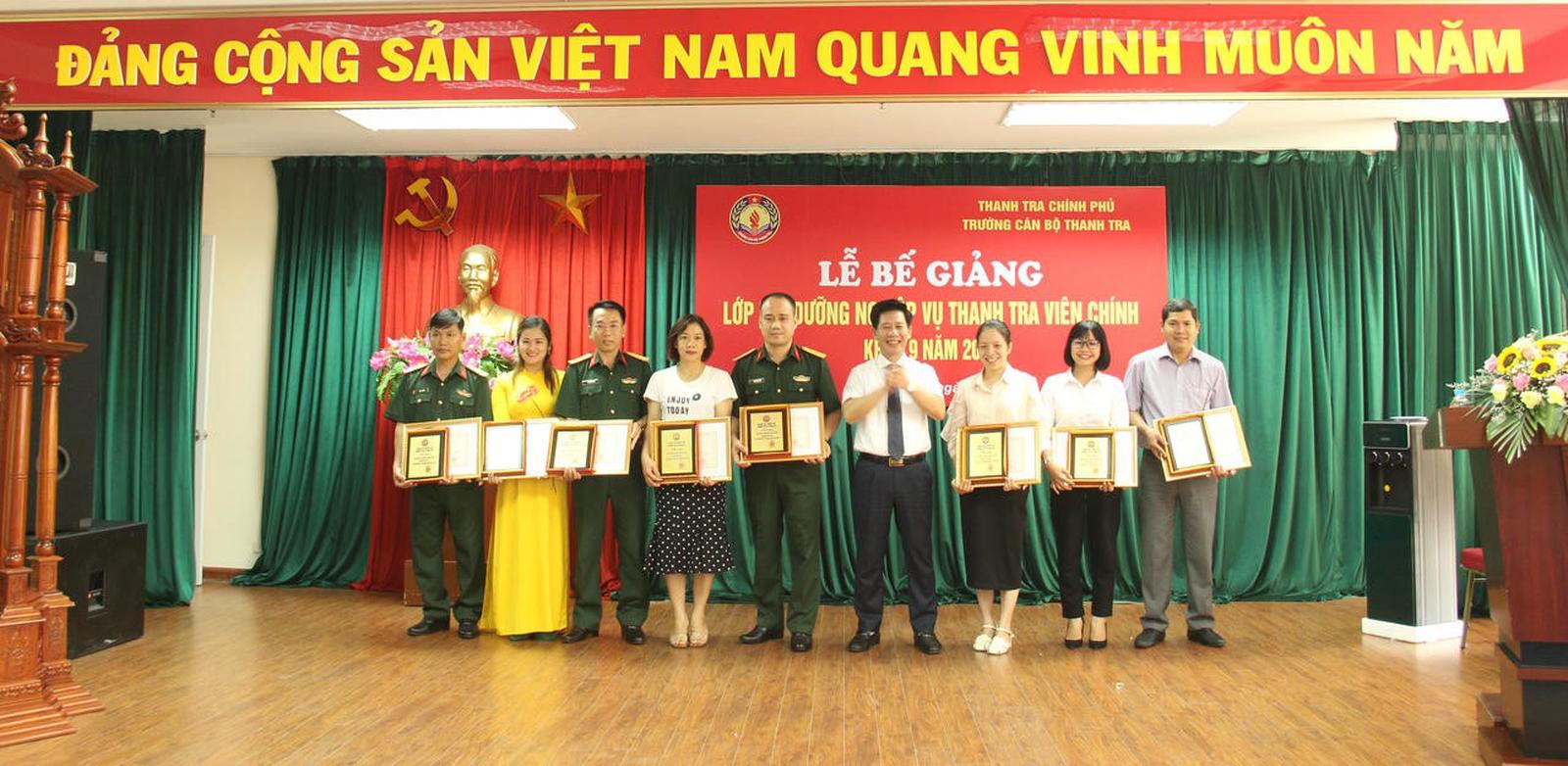 Trung tá Nguyễn Hữu Quý cùng các học viên lớp nghiệp vụ Thanh tra viên chính K9/2022 được Hiệu trưởng Trường Cán bộ Thanh tra trao giấy khen và kỷ niệm chương của trường. Ảnh: NVCC