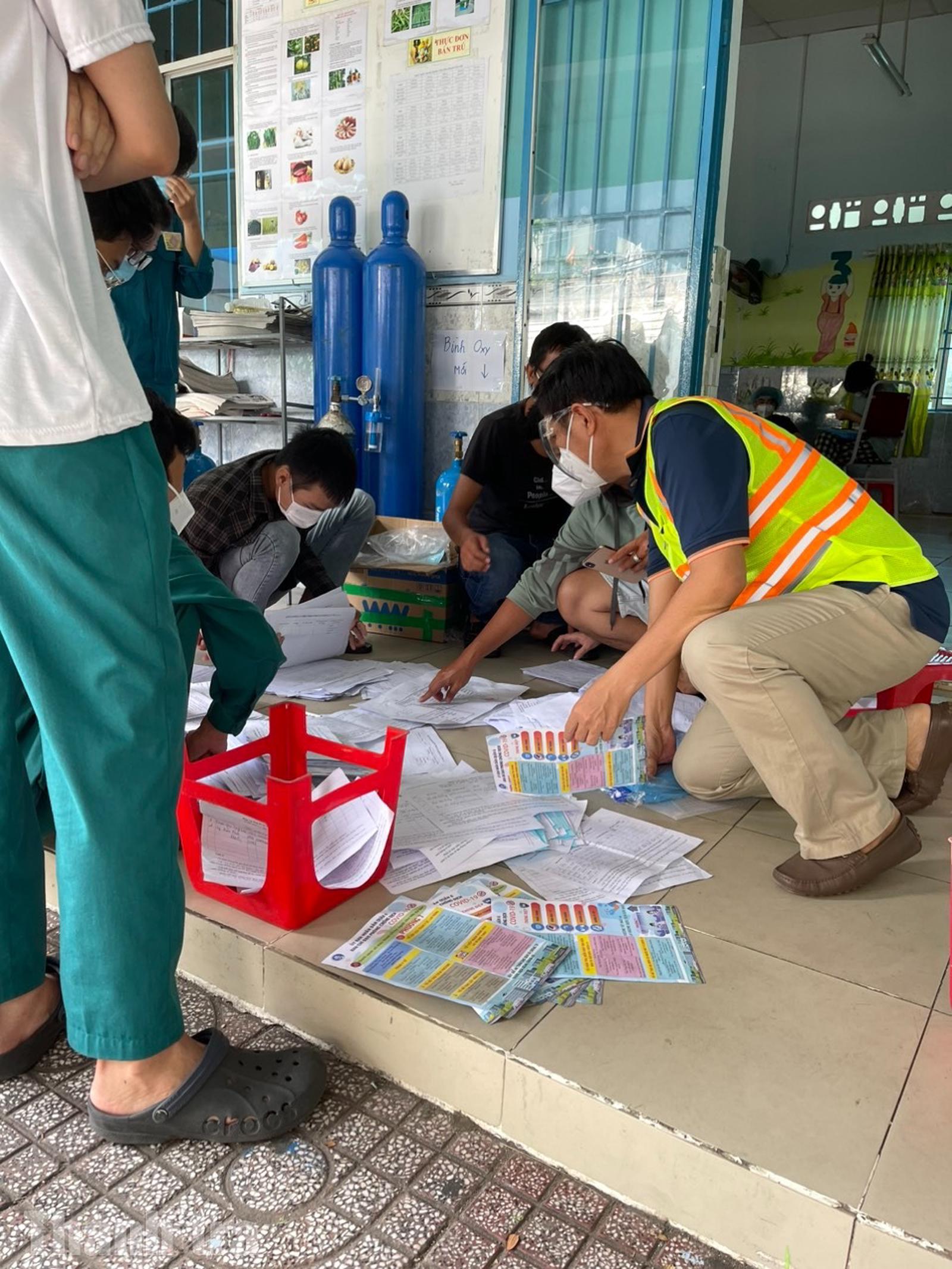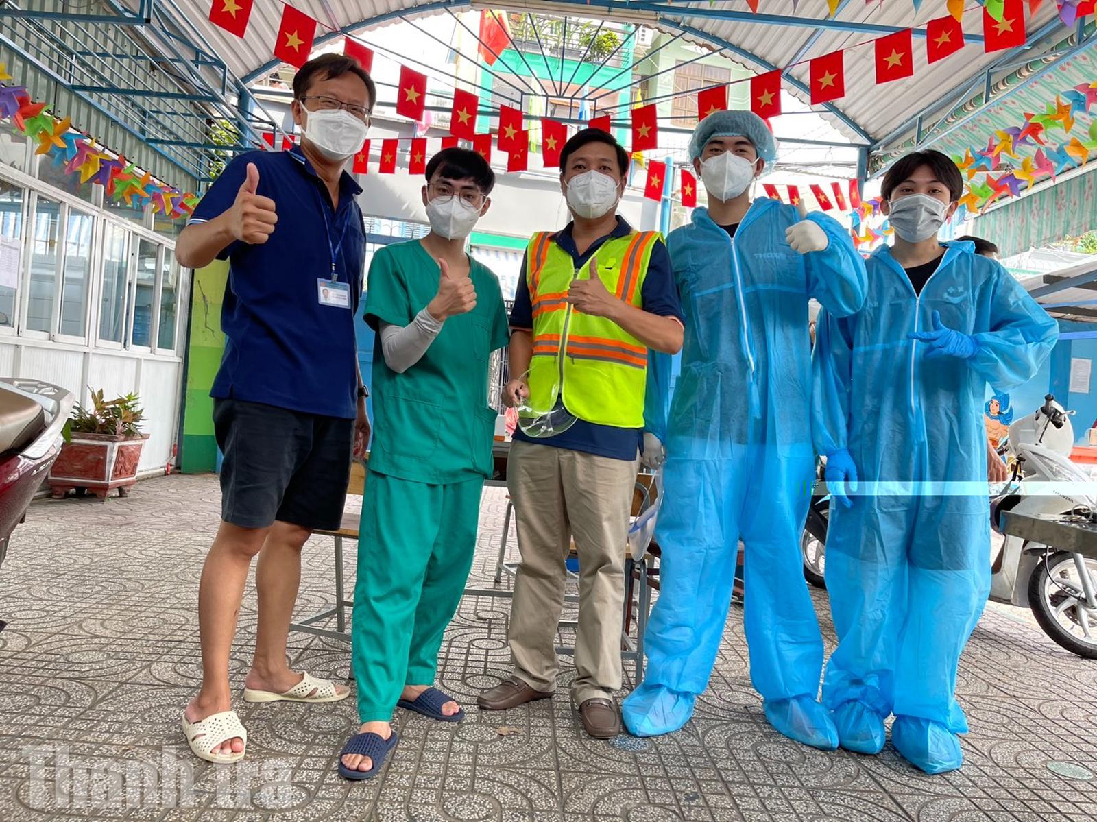Anh Mai Quốc Khánh (ở giữa) đã xung phong đăng ký và được UBND TP Hồ Chí Minh ra quyết định phân công tham gia đoàn công tác phòng, chống dịch COVID-19 tại Phường 7, Quận 6 (nay là phường Bình Tiên). Ảnh: Cao Tần