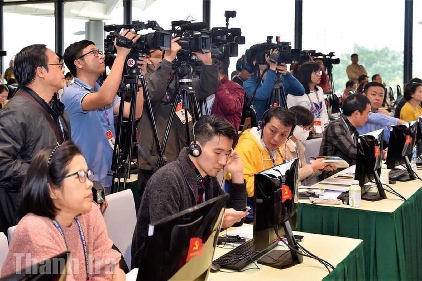 Các nhà báo, phóng viên tác nghiệp tại Trung tâm Báo chí Đại hội XIII. Ảnh: Nhật Bắc