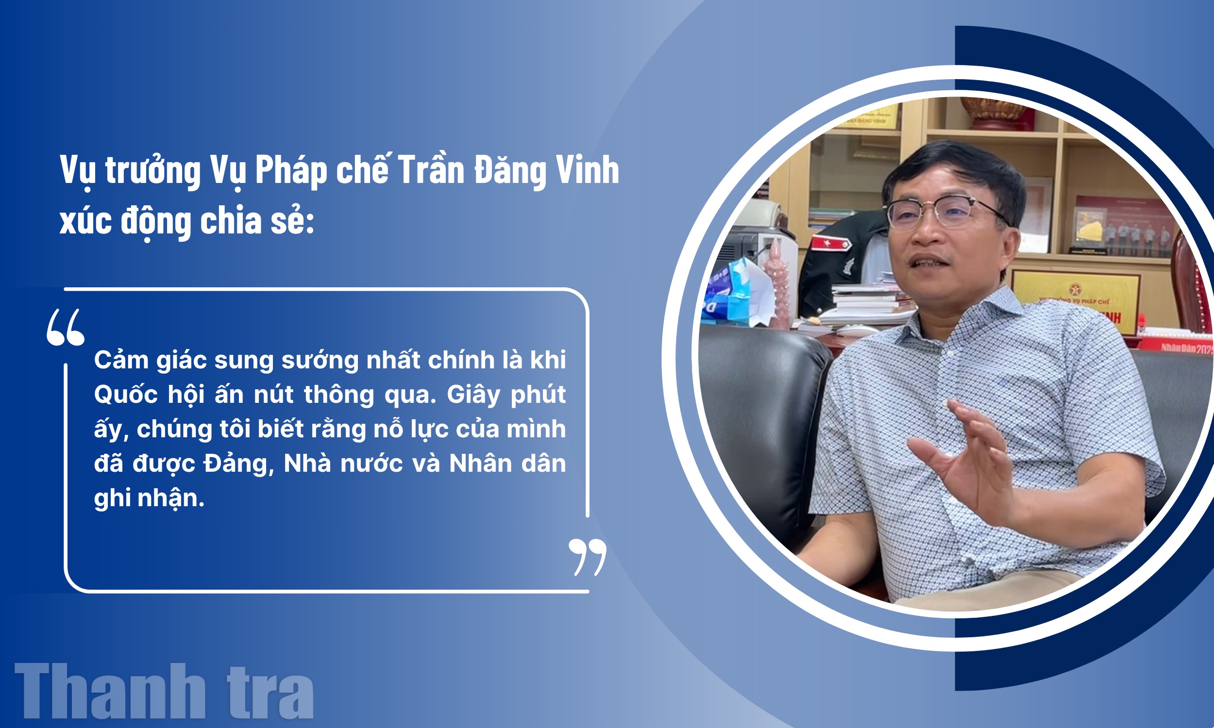 Cảm xúc vỡ òa không chỉ đến từ sự ghi nhận của Đảng ủy Chính phủ, mà còn từ khoảnh khắc lịch sử khi Quốc hội biểu quyết thông qua dự án Luật. Vụ trưởng Vụ Pháp chế Trần Đăng Vinh, người trực tiếp phụ trách soạn thảo, xúc động chia sẻ: “Cảm giác sung sướng nhất chính là khi Quốc hội ấn nút thông qua. Giây phút ấy, chúng tôi biết rằng nỗ lực của mình đã được Đảng, Nhà nước và Nhân dân ghi nhận”.
