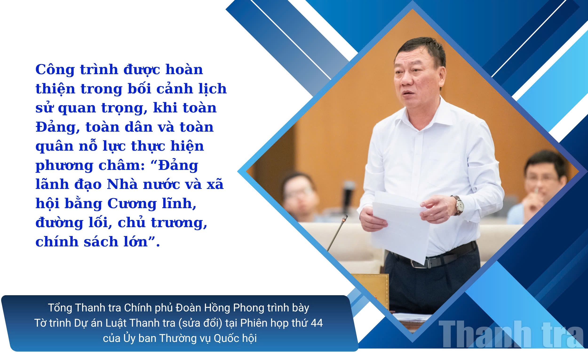 Đây không chỉ là niềm tự hào của toàn ngành Thanh tra, mà còn là minh chứng hùng hồn cho vai trò lãnh đạo toàn diện, trực tiếp của Đảng đối với công tác xây dựng pháp luật - biểu tượng cho ý chí đổi mới, khát vọng hành động và tinh thần xây dựng hệ thống cơ quan thanh tra tinh, gọn, mạnh, hiệu năng, hiệu lực, hiệu quả.