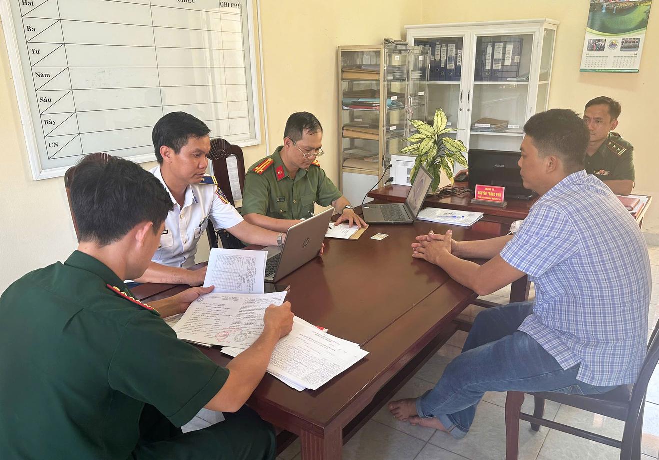 Lực lượng chức năng làm việc với thuyền trưởng tàu cá vi phạm tắt thiết bị giám sát hành trình. Ảnh: Công an An Giang