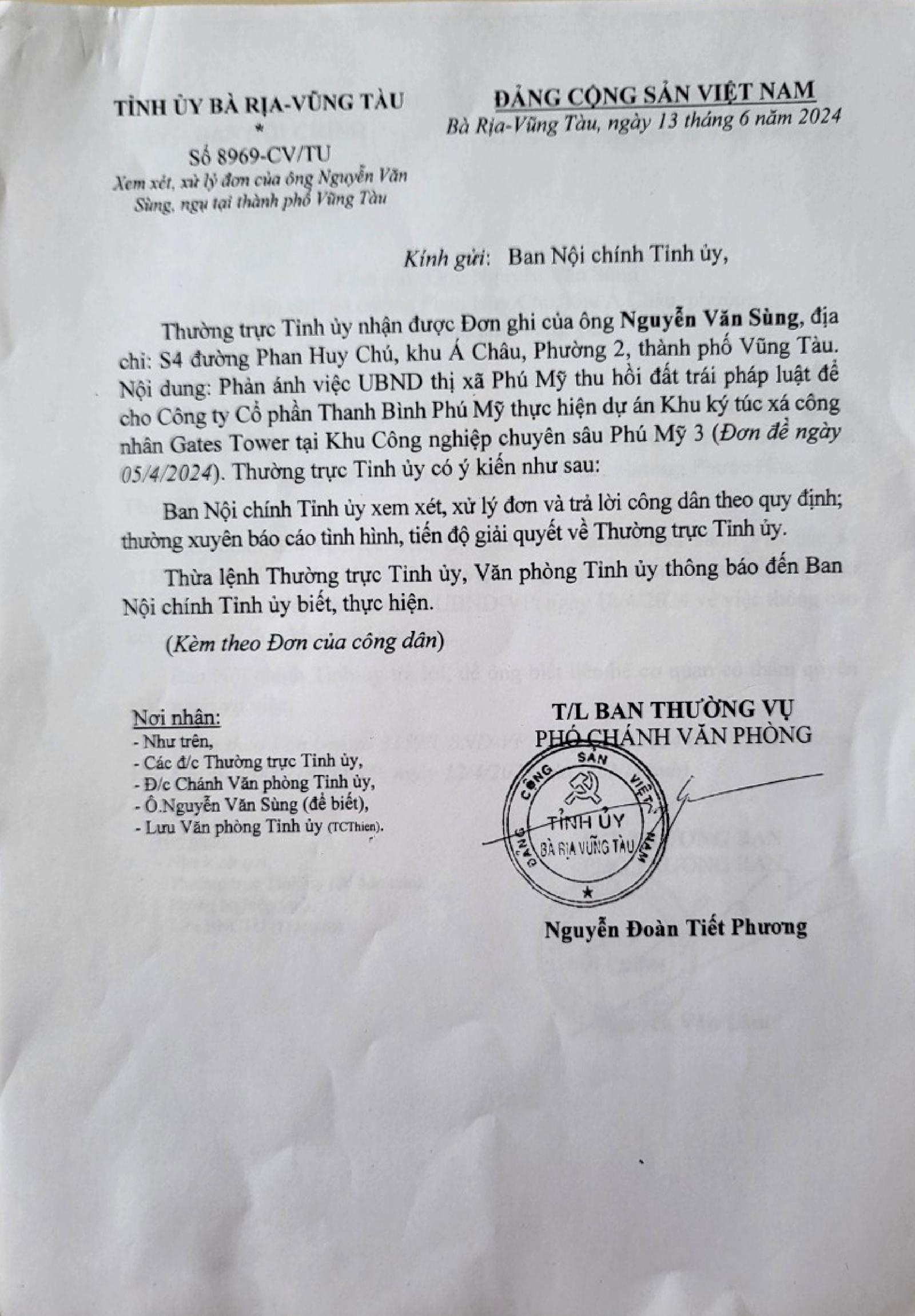 Cụ thể, ông Sùng đã làm đơn gửi đến Tỉnh ủy Bà Rịa - Vũng Tàu để phản ánh việc UBND thị xã Phú Mỹ thu hồi đất trái pháp luật cho Công ty Cổ phần Thanh Bình - Phú Mỹ thực hiện dự án chuyên sâu Phú Mỹ III.