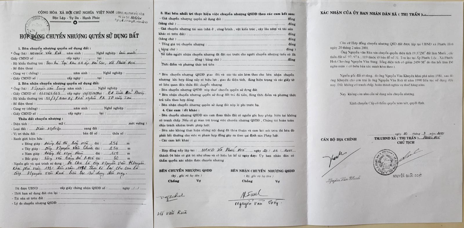 Ông Nguyễn Văn Sùng nhận chuyển nhượng đất từ ông Nguyễn Văn Rùa bằng hợp đồng chuyển nhượng đất do UBND xã Phước Hòa (nay là phường Phước Hòa) lập và xác nhận hồ sơ số 362/CN, ngày 6/3/2001. Ảnh: Trung Khánh