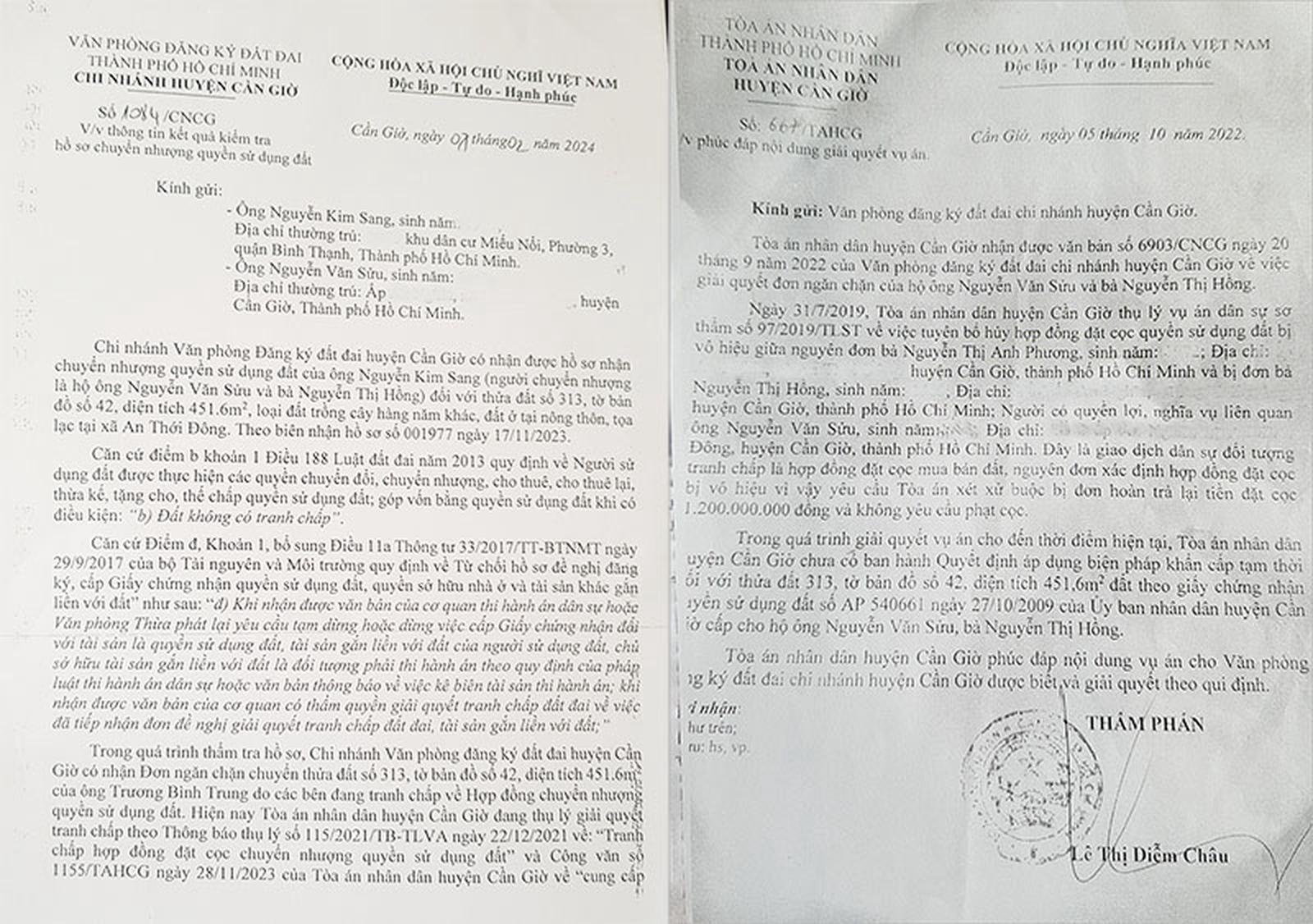 Ngày 9/1/2024, Chi nhánh Văn phòng ĐKĐĐ huyện Cần Giờ có Văn bản số 251/CNCG gửi TAND huyện Cần Giờ, đề nghị hỗ trợ, cung cấp thông tin về việc giải quyết tranh chấp hợp đồng đặt cọc chuyển nhượng QSDĐ đối với thửa đất nêu trên.