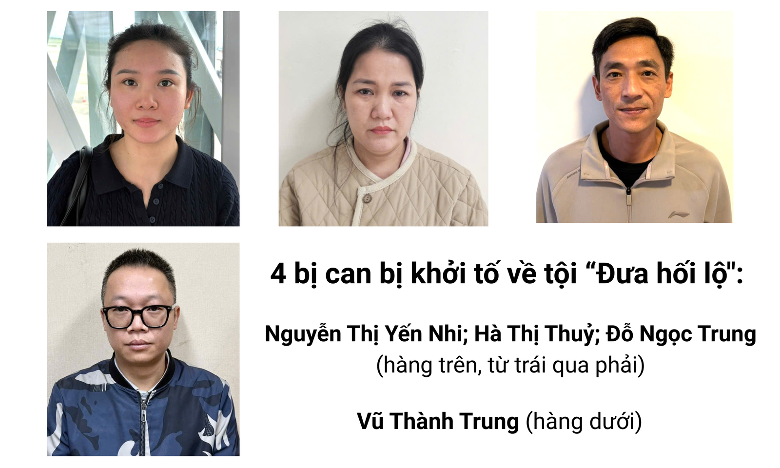 4 bị can về tội “Đưa hối lộ”, gồm: Nguyễn Thị Yến Nhi, Giám đốc Chi nhánh 3, Công ty Trái cây Thủy; Hà Thị Thuỷ, Giám đốc Công ty Thảo Nguyên Hà Giang; Đỗ Ngọc Trung, Giám đốc Công ty Đức Phúc; Vũ Thành Trung, Giám đốc Công ty JiuYi.