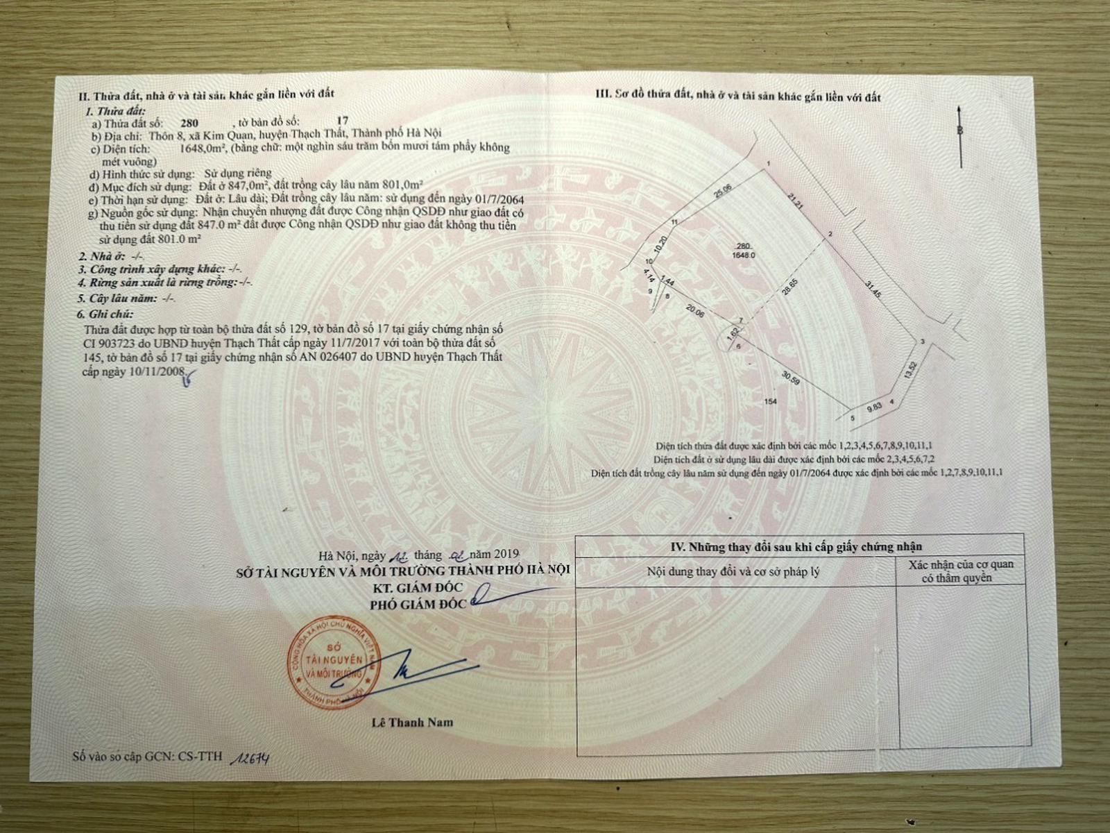 Năm 2018, vợ chồng ông Nguyễn Thanh Minh và bà Kiều Nguyệt Nga nhận chuyển nhượng 2 thửa đất của bà Nguyễn Thị Vinh tại xã Kim Quan (huyện Thạch Thất), gồm các thửa số 145 (847m2, GCNQSDĐ cấp năm 2008) và thửa 129 (801m2, GCNQSDĐ cấp năm 2017). Sau đó, vợ chồng ông Minh đã làm thủ tục cấp đổi GCNQSDĐ, xin gộp thửa và đến ngày 12/2/2019 thì được Sở Tài nguyên và Môi trường (TN&MT) TP Hà Nội cấp GCNQSDĐ đối với thửa số 280, tờ bản đồ số 17, thôn 8 xã Kim Quan, diện tích 1.648m2 (847m2 đất ở và 801m2 ).