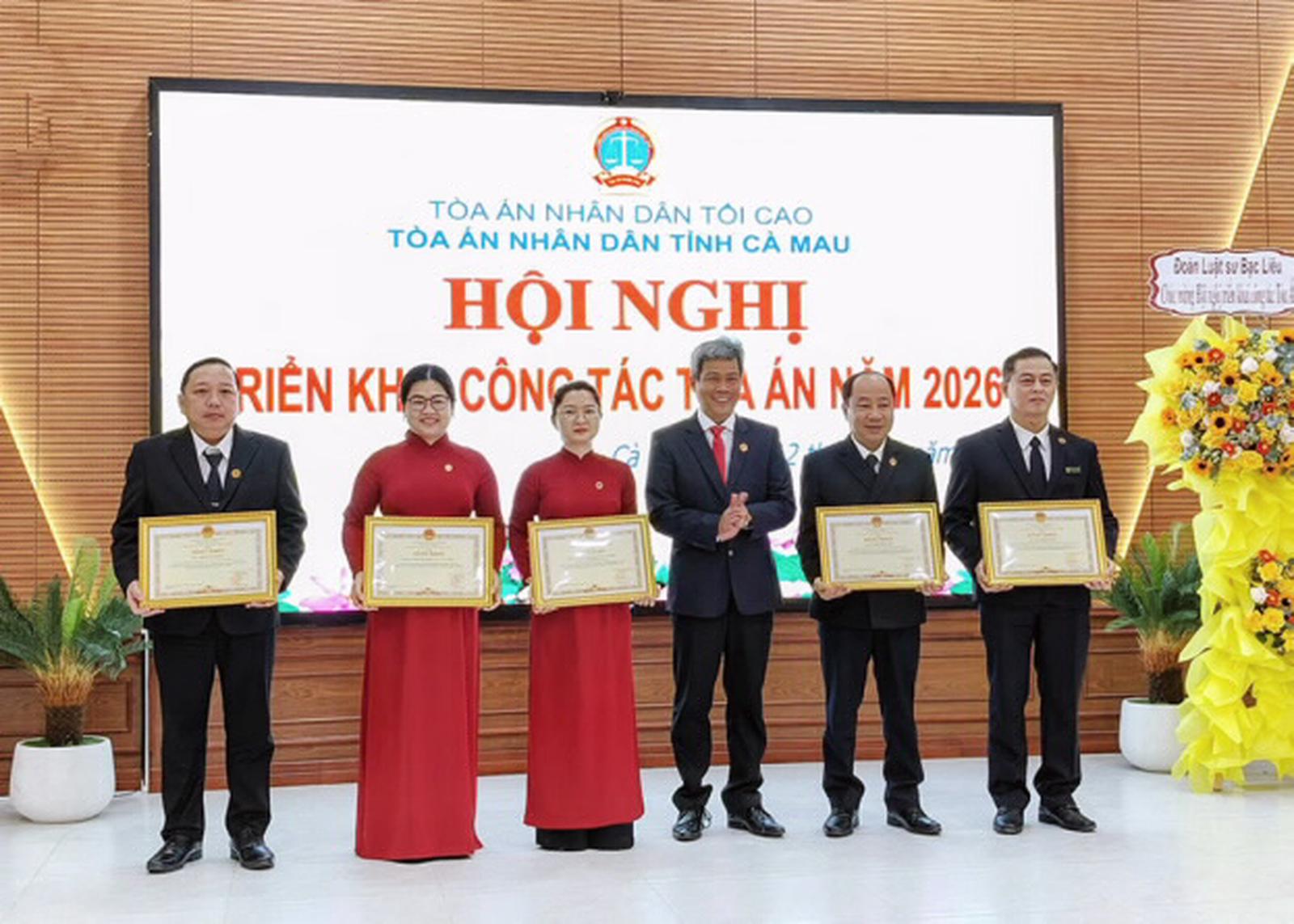 Ông Thái Rết - Chánh án TAND tỉnh Cà Mau trao Bằng khen của UBND tỉnh Cà Mau cho các cá nhân tại hội nghị triển khai công tác tòa án năm 2026. Ảnh: Huỳnh Mãy/Cổng TTĐT TAND tỉnh Cà Mau