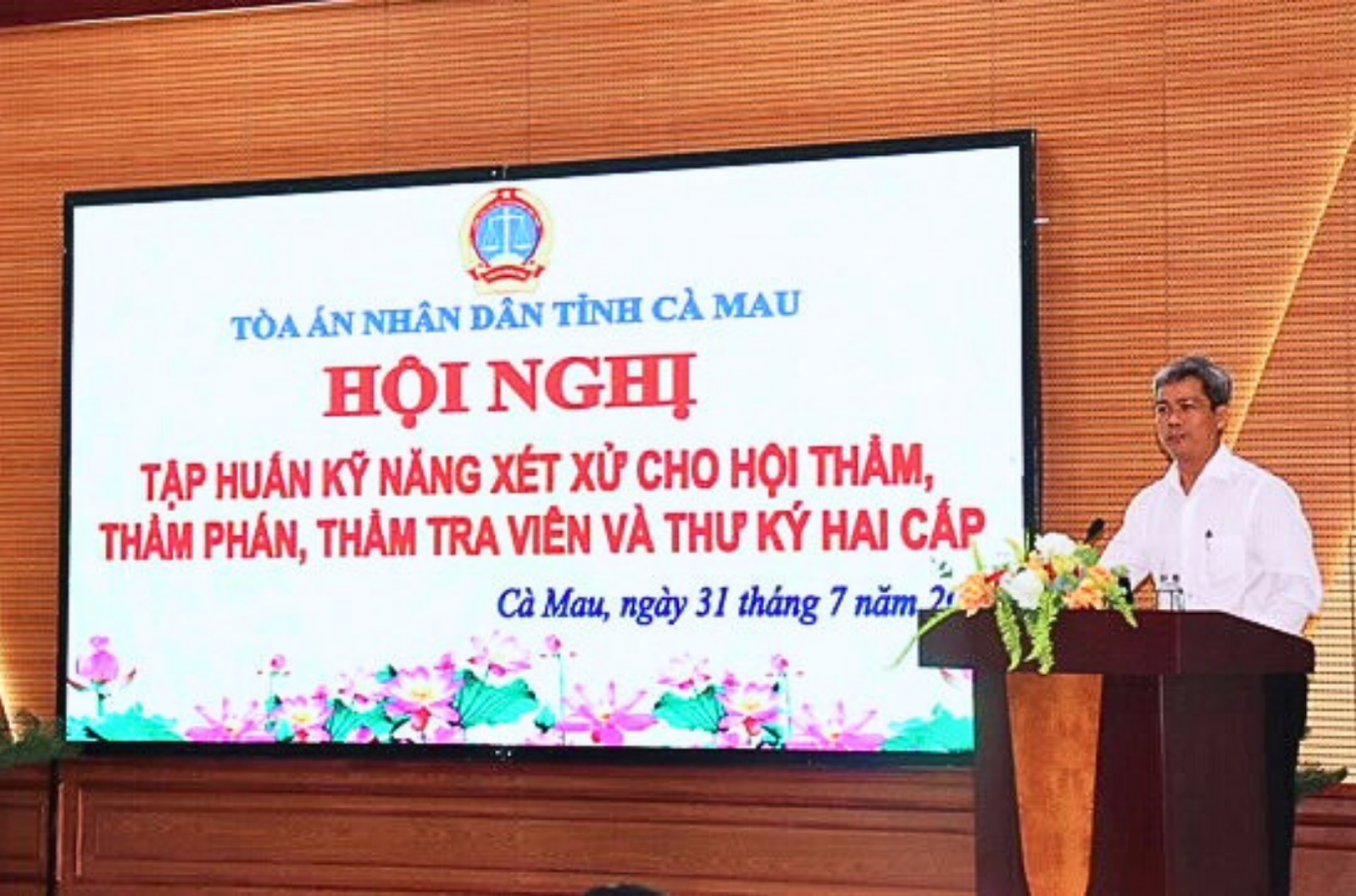 Ông Thái Rết - Chánh án TAND tỉnh Cà Mau phát biểu tại hội nghị tập huấn nghiệp vụ năm 2025. Ảnh: Vĩnh Hải/ Cổng TTĐT TAND tỉnh Cà Mau