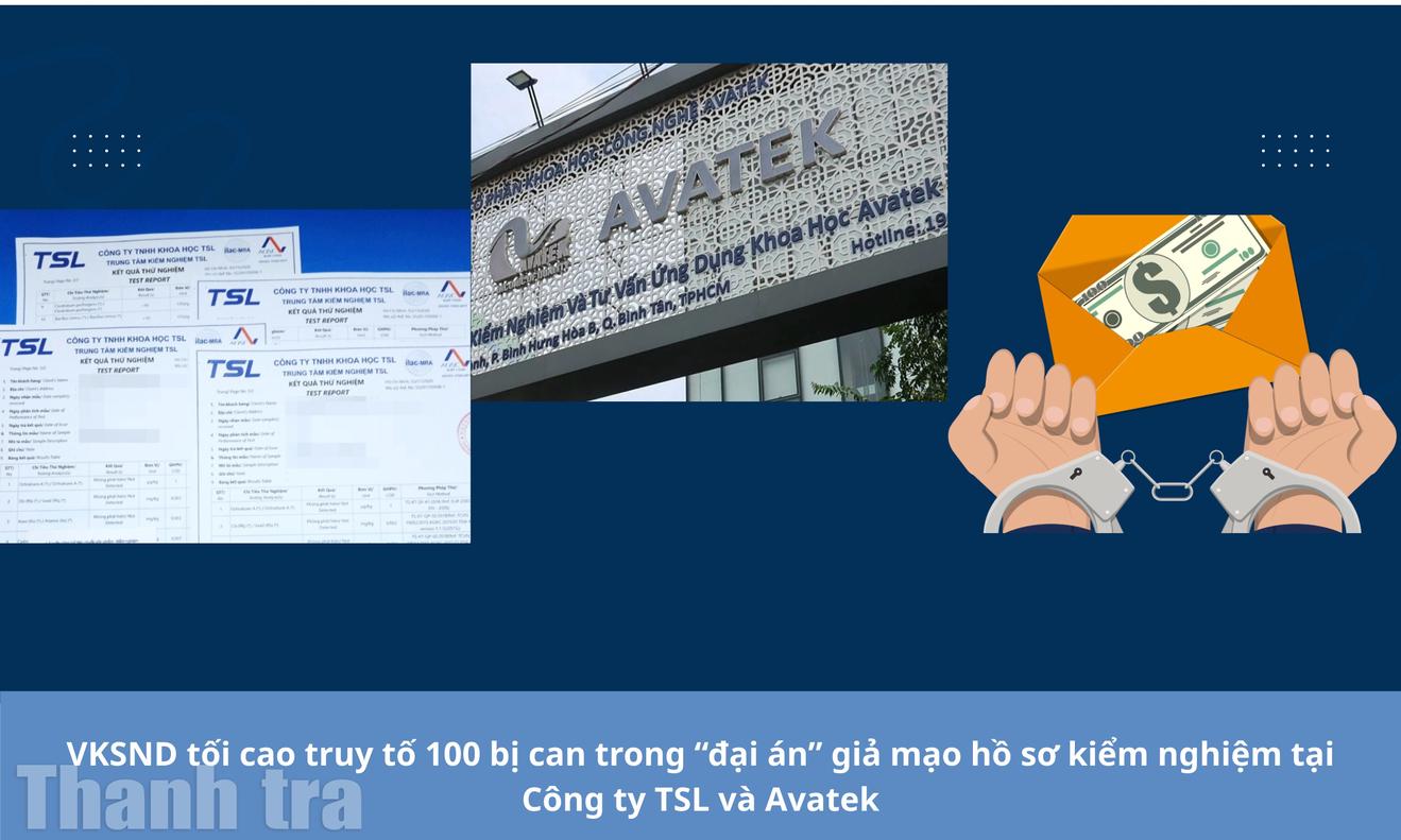 (Thanh tra) - 100 bị can bị Viện kiểm sát nhân dân tối cao truy tố trong vụ án xảy ra tại Công ty TNHH Khoa học TSL (Công ty TSL), Công ty cổ phần khoa học công nghệ Avatek và 28 công ty khác, với các tội danh “Giả mạo trong công tác”, “Đưa hối lộ”, “Nhận hối lộ” và “Lợi dụng ảnh hưởng đối với người có chức vụ, quyền hạn để trục lợi”.