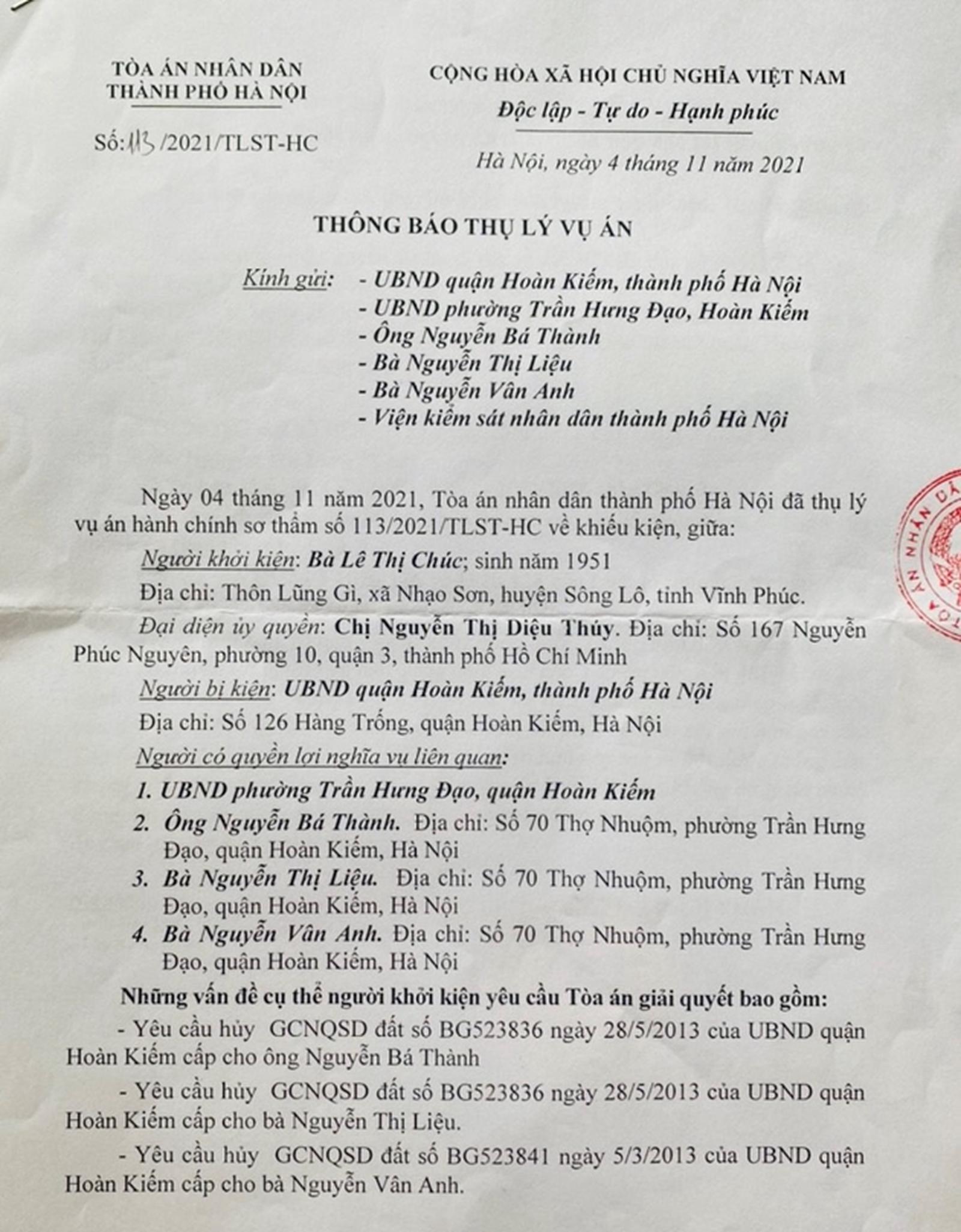 Ngày 4/11/2021, TAND TP Hà Nội đã có Thông báo số 113/2021/TLST-HC về việc thụ lý vụ án gửi UBND quận Hoàn Kiếm và các tổ chức, cá nhân có liên quan.