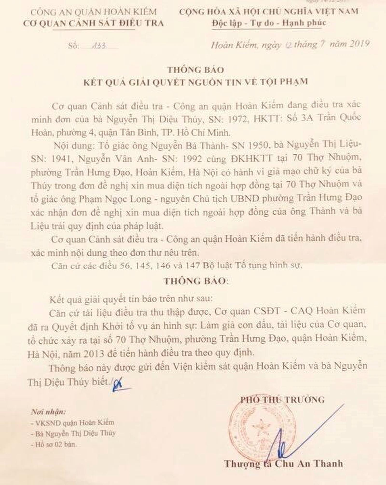 Ngày 12/7/2019, Công an quận Hoàn Kiếm tiếp tục có Thông báo số 133 về việc giải quyết nguồn tin về tội phạm đối với bà Nguyễn Thị Diệu Thuý tố giác ông Nguyễn Bá Thành, bà Nguyễn Thị Liệu, bà Nguyễn Vân Anh, cùng đăng ký hộ khẩu thường trú tại 70 Thợ Nhuộm, phường Trần Hưng Đạo, quận Hoàn Kiếm, Hà Nội có hành vi giả mạo chữ ký của bà Thúy trong đơn đề nghị xin mua diện tích ngoài hợp đồng tại 70 Thợ Nhuộm và tố giác ông Phạm Ngọc Long - nguyên Chủ tịch UBND phường Trần Hưng Đạo (nay đã nghỉ hưu theo chế độ PV) xác nhận đơn đề nghi xin mua diện tích ngoài hợp đồng của ông Thành và bà Liệu trái quy định của pháp luật.