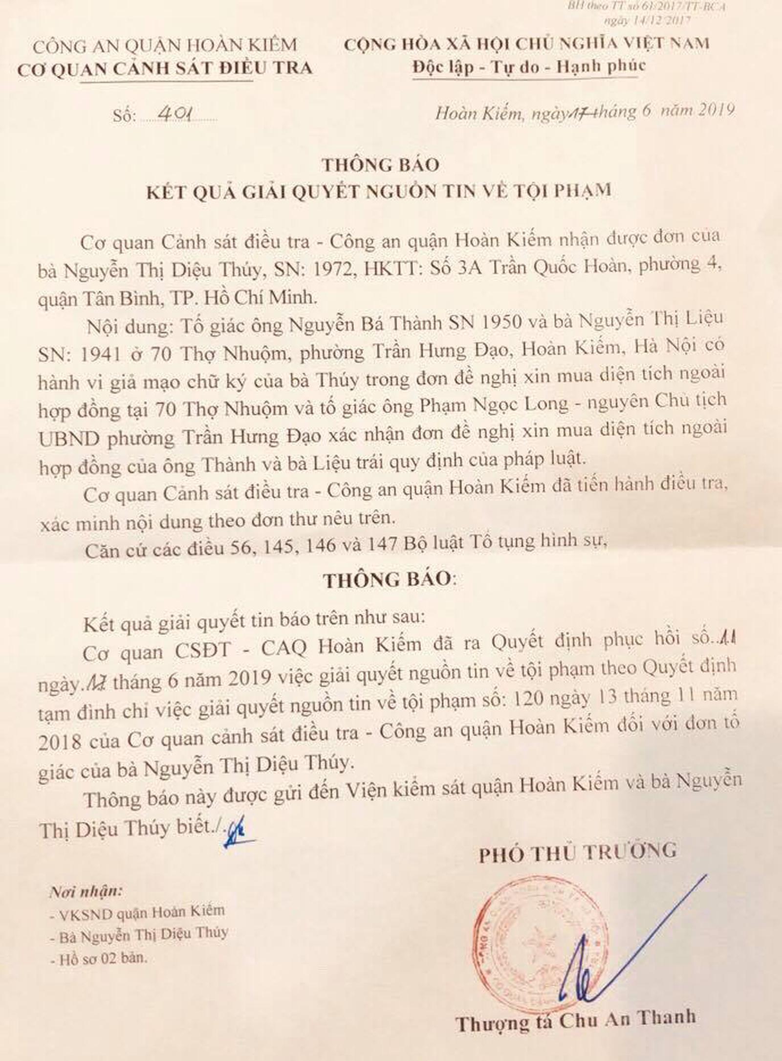 Ngày 17/6/2019, Công an quận Hoàn Kiếm có Thông báo số 401 về việc giải quyết nguồn tin về tội phạm đối với bà Nguyễn Thị Diệu Thuý tố giác ông Nguyễn Bá Thành, bà Nguyễn Thị Liệu có hành vi giả mạo chữ ký của bà Thúy trong đơn đề nghị xin mua diện tích ngoài hợp đồng tại 70 Thợ Nhuộm và tố giác ông Phạm Ngọc Long - nguyên Chủ tịch UBND phường Trần Hưng Đạo xác nhận đơn đề nghị xin mua diện tích ngoài hợp đồng của ông Thành, bà Liệu trái quy định của pháp luật.