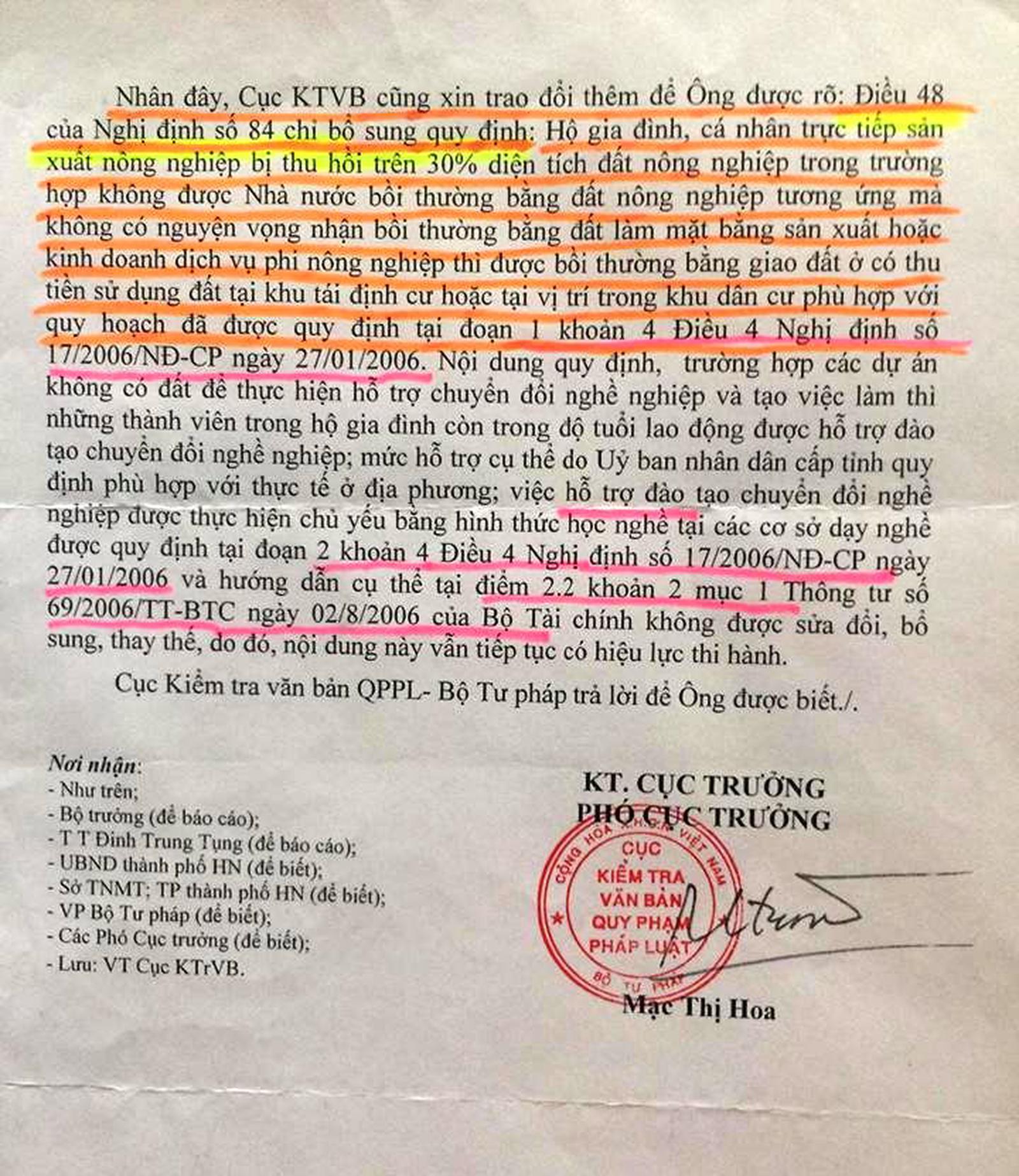 Ngày 23/4/2014, Cục Kiểm tra văn bản quy phạm pháp luật (Cục Kiểm tra VBQPPL), Bộ Tư pháp đã có Văn bản số 84/Ktr-VB, kết luận: "Thực hiện nhiệm vụ kiểm tra văn bản theo thẩm quyền quy định tại NĐ số 40/2010/NĐ-CP ngày 12/4/2010 của Chính phủ về kiểm tra và xử lý VBQPPL, Cục Kiểm tra VBQPPL đã tiến hành kiểm tra, đồng thời để có thêm cơ sở, Cục đã chủ trì, tổ chức cuộc họp với đại diện cơ quan liên quan như: Tổng cục Quản lý đất đai, Bộ Tài nguyên và Môi trường (TN&MT); Sở TN&MT Hà Nội; Sở Tư pháp TP Hà Nội. Bước đầu nhận thấy rằng, ý kiến phản ánh nêu trên của công dân đối với Quyết định số 137/QĐ-UBND ngày 30/11/2007 về việc ban hành quy định về bồi thường hỗ trợ và tái định cư trên địa bàn TP Hà Nội đã chậm trong khi NĐ số 17/2006 đã có hiệu lực pháp luật hơn 1 năm là có cơ sở".
