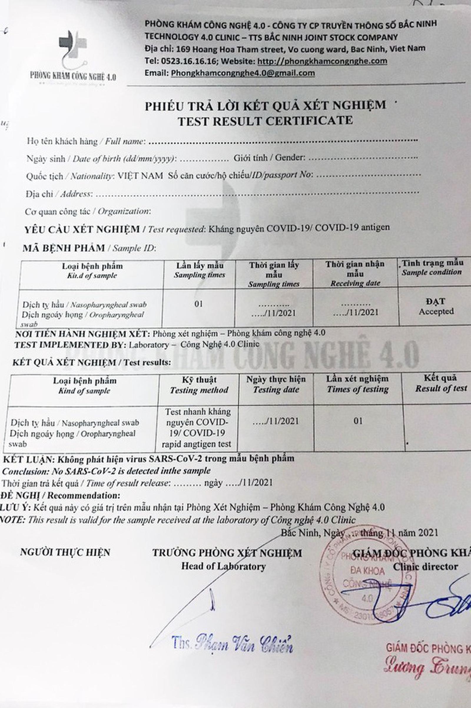 Một mẫu giấy kết quả xét nghiệm Covid-19 khống bị thu giữ