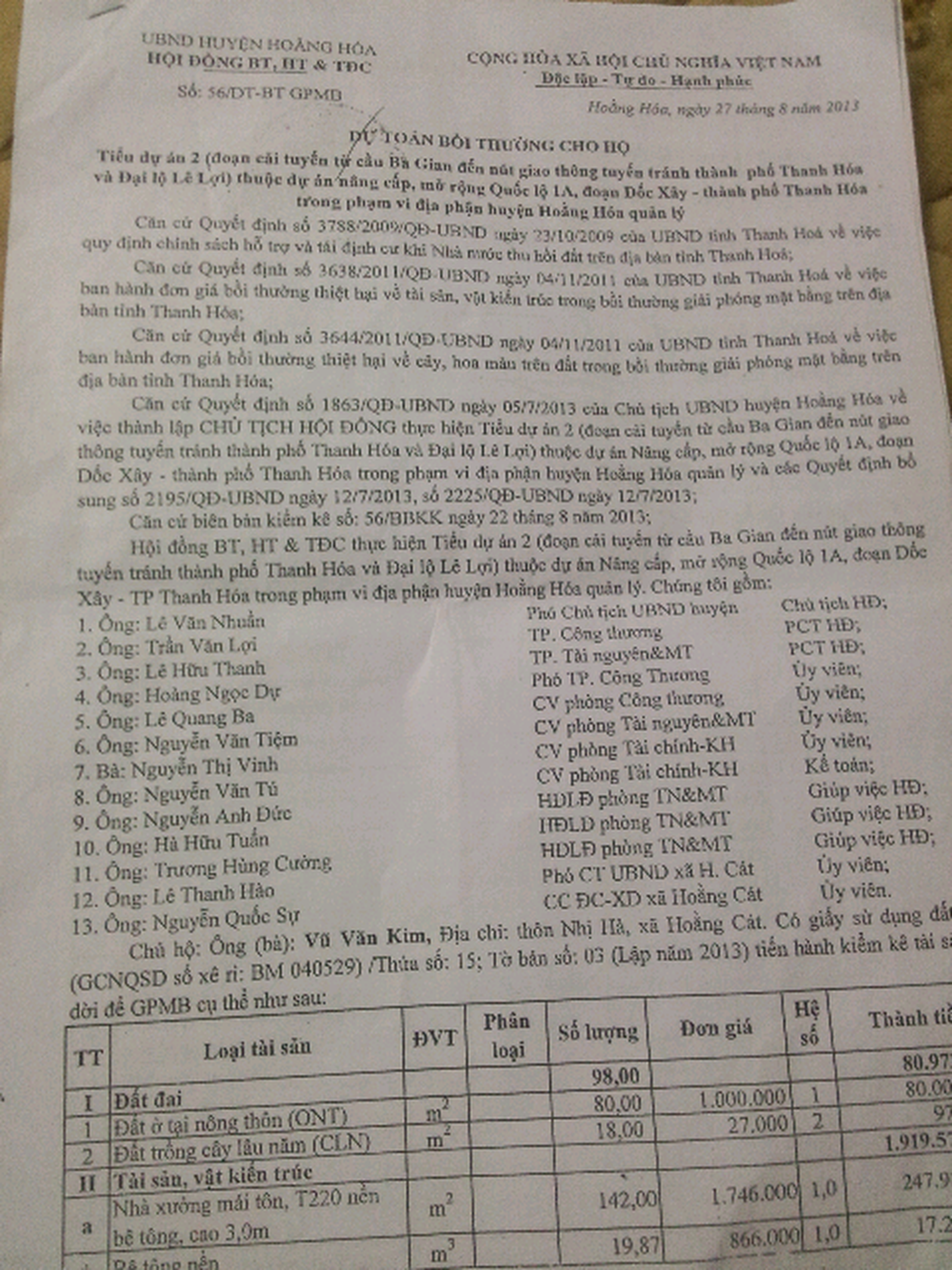 Đó là trường hợp hi hữu của gia đình ông Vũ Văn Kim, thôn Nhị Hà, xã Hoằng Cát, huyện Hoằng Hóa, tỉnh Thanh Hóa. Năm 2013, thực hiện Tiểu dự án 2 (đoạn cải tuyến từ cầu Ba Gian đến nút giao thông tuyến tránh TP Thanh Hóa và Đại lộ Lê Lợi) thuộc dự án nâng cấp, mở rộng Quốc lộ IA đoạn Dốc Xây – TP Thanh Hóa trong phạm vi địa phận Hoằng Hóa quản lý). Theo dự toán bồi thường, hộ gia đình ông Vũ Văn Kim phải thu hồi 98m2 đất trồng cây lâu năm và đất ở; tài sản vật kiến trúc nhà xưởng và nhà ở 2 tầng khung cột bê tông cốt thép … Tổng số tiền mà hộ gia đình ông Kim đã ký nhận bồi thường là hơn 2 tỷ đồng, trong đó riêng ngôi nhà cao tầng là gần 1,2 tỷ đồng.