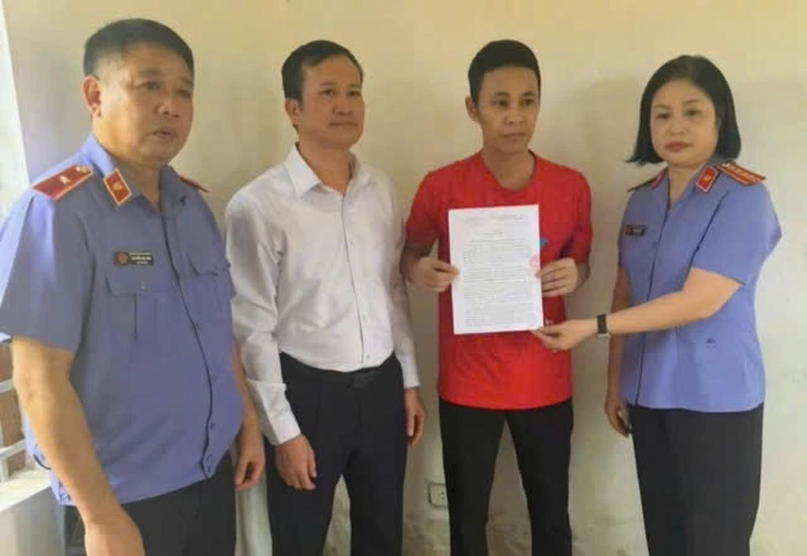 Đại diện Viện Kiểm sát Nhân dân tỉnh Hưng Yên và TAND tỉnh Hưng Yên trao quyết định Kháng nghị toàn bộ bản án sơ thẩm cho bị cáo Thái Khắc Thành tại Trại tạm giam Công an tỉnh Hưng Yên, trưa 13/8 (Ảnh: Xuân Hoa/Báo Chính phủ)