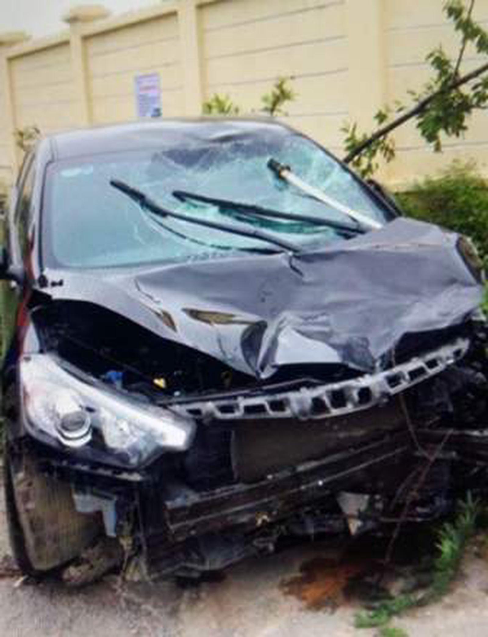 Phần đầu ô tô vỡ nát có một thanh kiếm nằm vắt nghiêng