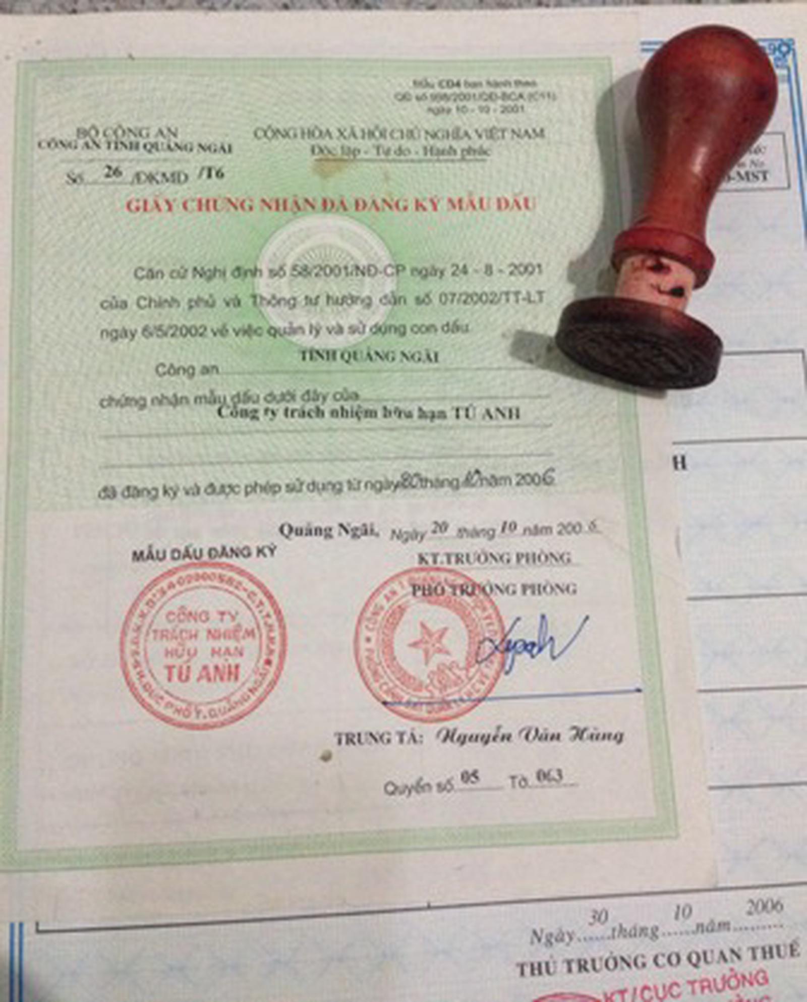 Giấy phép đăng ký kinh doanh và con dấu hiện Cty Tú Anh đang giữ. Ảnh: Ngọc Phó