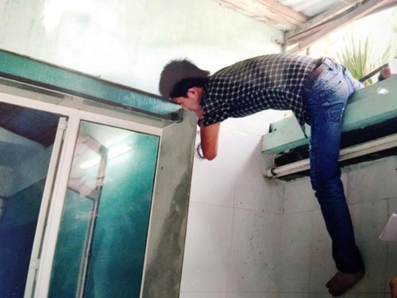Công trèo qua ô thoáng đột nhập nhà chị Hoa.Ảnh:Công an Kiến An cung cấp.