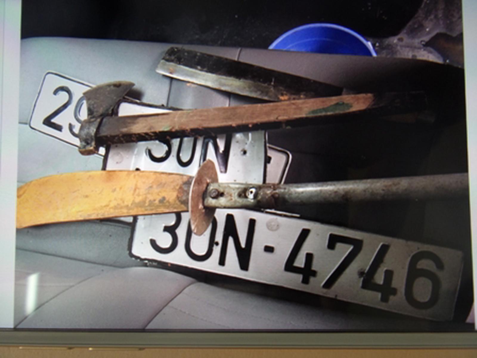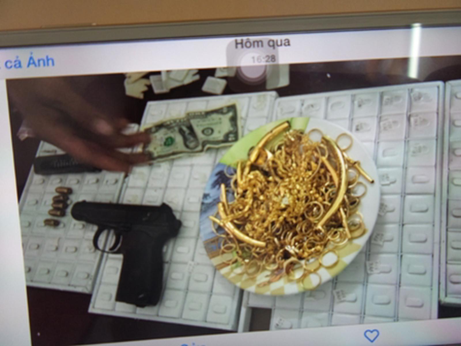 Lực lượng chức năng đã thu giữ được 1 xe ô tô 16 chỗ nhãn hiệu Toyota, phía trước đã tháo biển số, phía sau lắp BKS 29N - 8595, trên xe vương vãi kính vỡ và một số vàng. Đồng thời, thu giữ được các tang vật vụ án gồm: 1 khẩu súng k59 và 5 viên đạn; rìu tự chế, búa, khẩu trang, áo chống nắng; 150 chiếc nhẫn, 16 dây chuyền, 11 đôi bông tai, 1 chiếc lắc, 1 chiếc kiềng tất cả đều bằng kim loại vàng.
