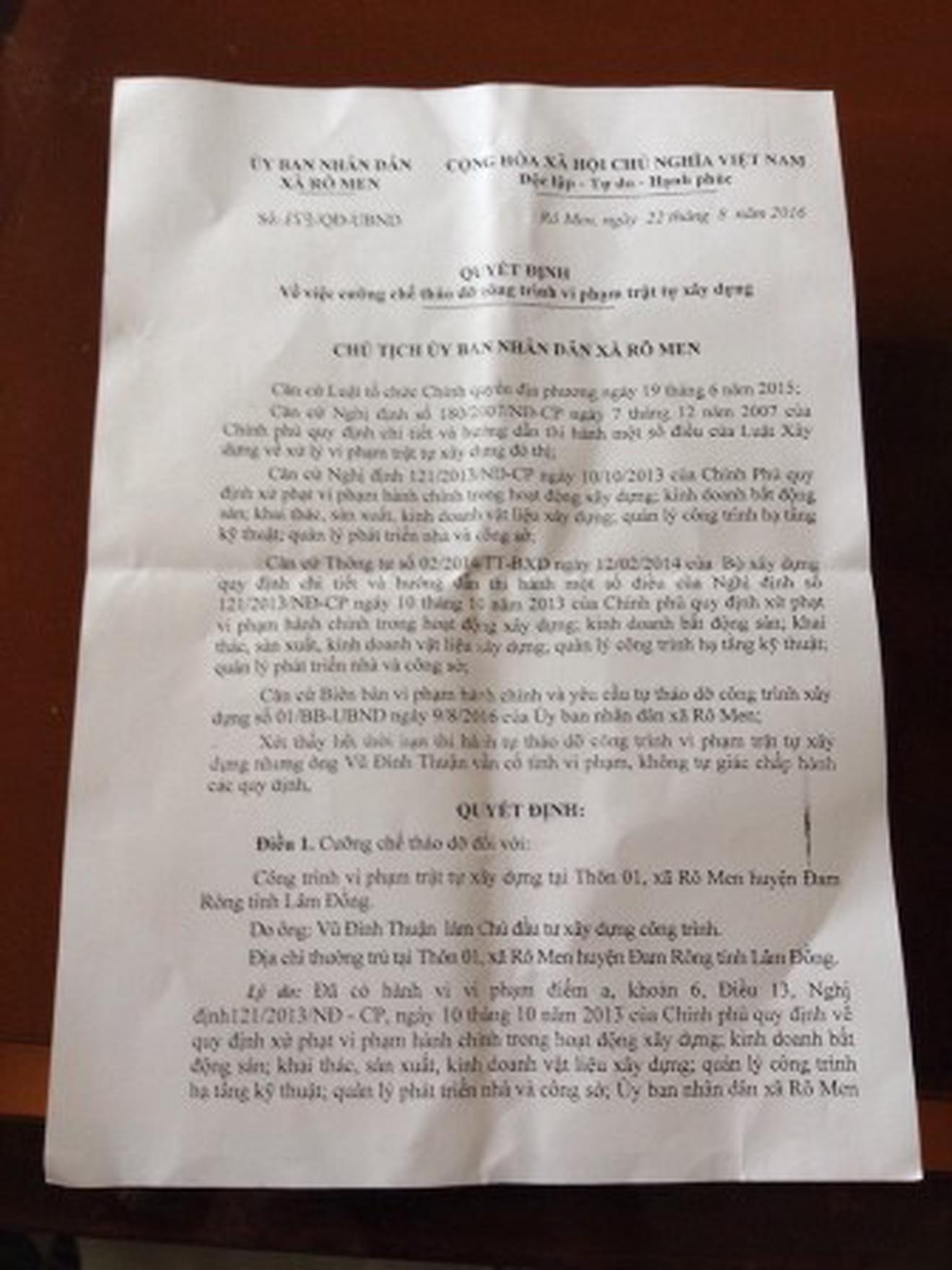 Tuy nhiên, ngày 22/8/2016, UBND xã Rô Men đã ra Quyết định hành chính số 159/QĐ-UBND về việc cưỡng chế tháo dỡ công trình vi phạm trật tự xây dựng đối với công trình xây dựng nhà ở do ông Vũ Đình Thuận làm chủ.