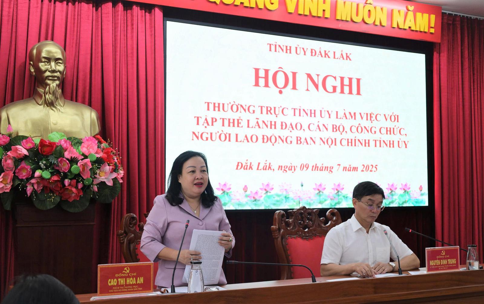 Tại buổi làm việc, Ban Nội chính Tỉnh ủy Đắk Lắk đã đưa ra một số kiến nghị, đề xuất quan trọng. Trong đó có việc quan tâm bố trí trụ sở làm việc đảm bảo cho cán bộ, công chức sau hợp nhất; cho chủ trương bố trí bộ phận công chức ở cơ sở 2 (phường Tuy Hòa) để tiếp tục triển khai một số nhiệm vụ; và cho chủ trương tổ chức tập huấn, bồi dưỡng nghiệp vụ về công tác nội chính, phòng chống tham nhũng, lãng phí tiêu cực đối với cấp ủy trực thuộc Tỉnh ủy.