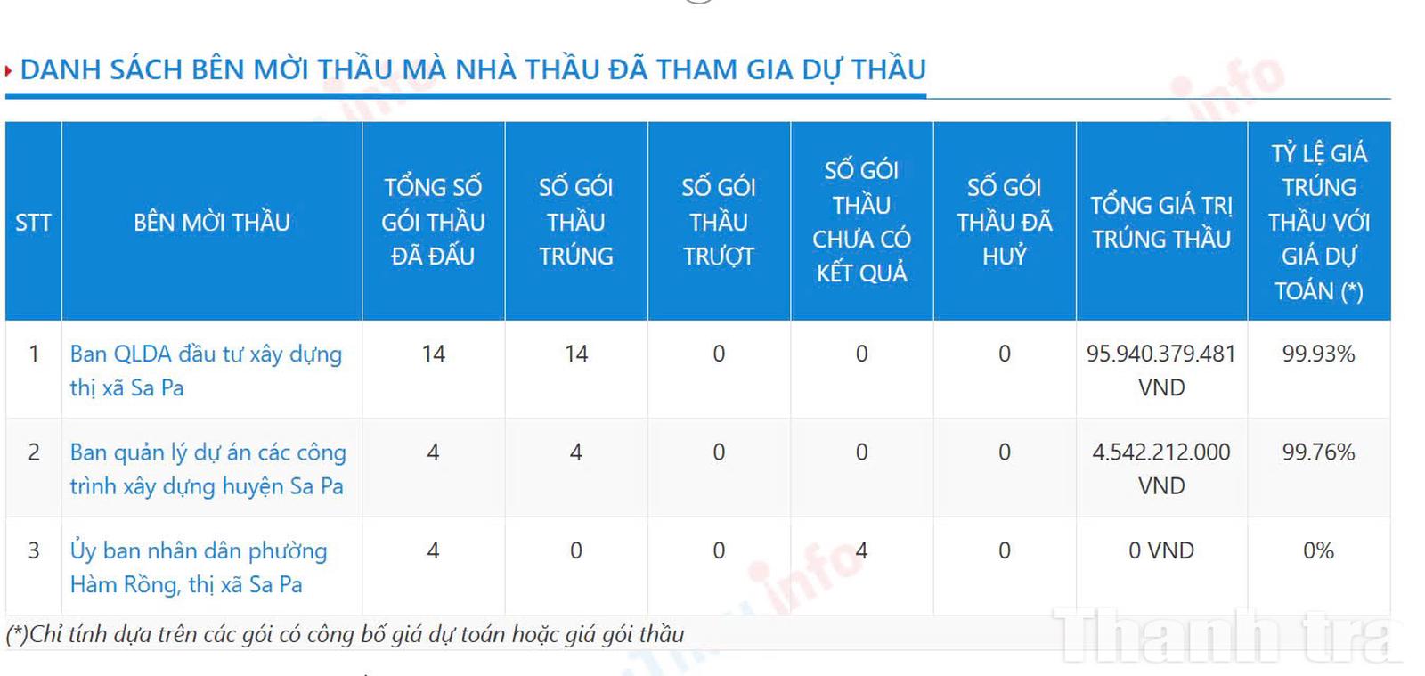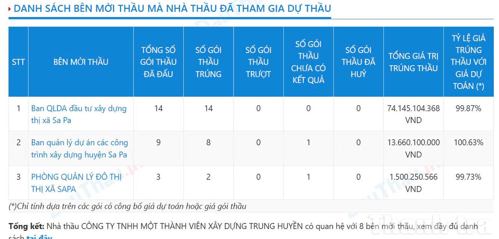 Cụ thể, theo tìm hiểu, Công ty TNHH Một thành viên Xây dựng Trung Huyền cũng là một doanh nghiệp trên địa bàn Thị xã Sa Pa, có trụ sở tại số nhà 446, Đường Điện Biên Phủ. Doanh nghiệp đã trúng cả 22/23 gói thầu (01 gói thầu bị hủy) mà doanh nghiệp này tham dự tại Ban QLDA ĐTXD thị xã Sa Pa. Tổng giá trị các gói thầu mà doanh nghiệp này đã trúng tại Ban QLDA ĐTXD thị xã Sa Pa là 87.805.220.605 VND, tỷ lệ giá trúng thầu so với giá dự toán là 100,25%.