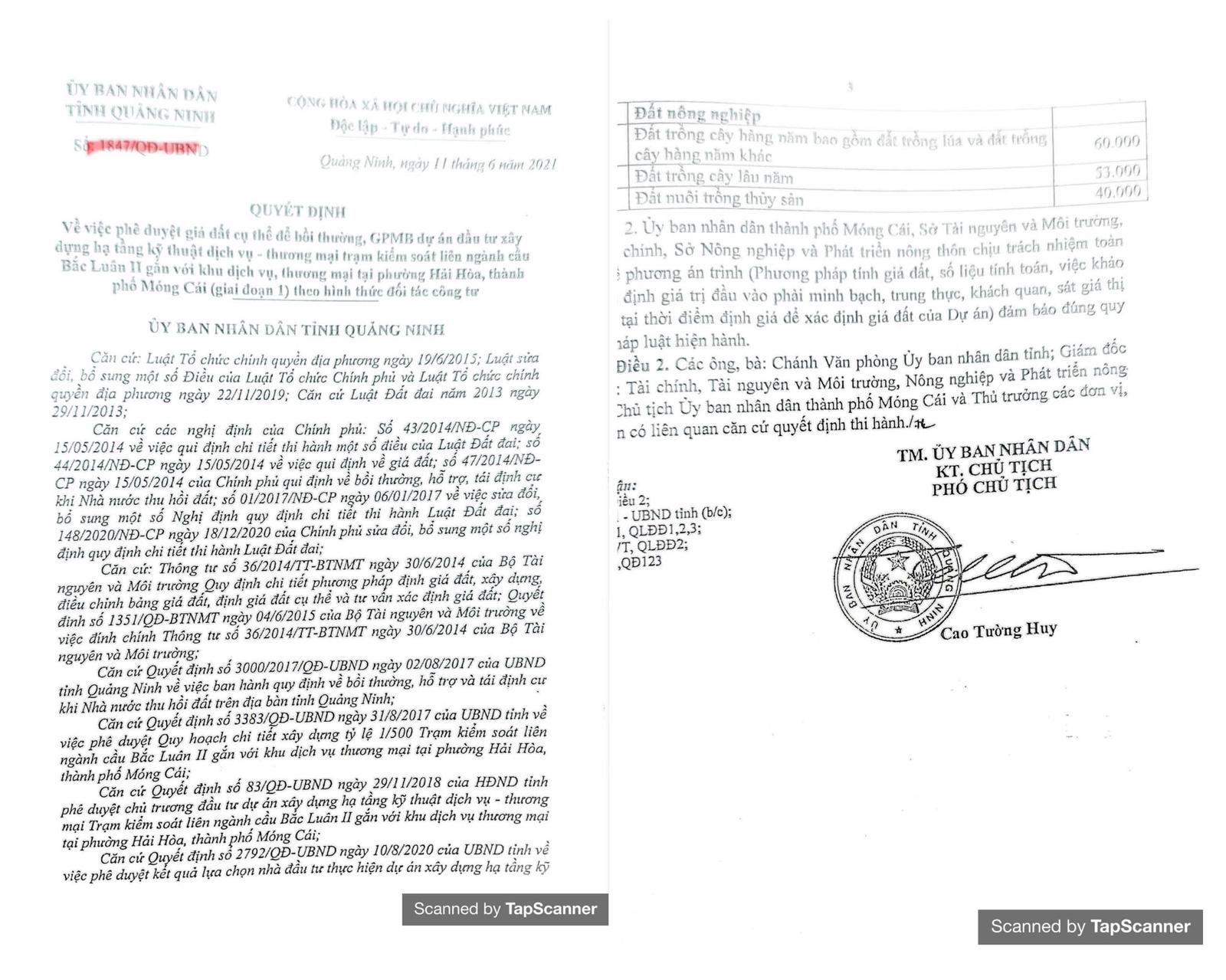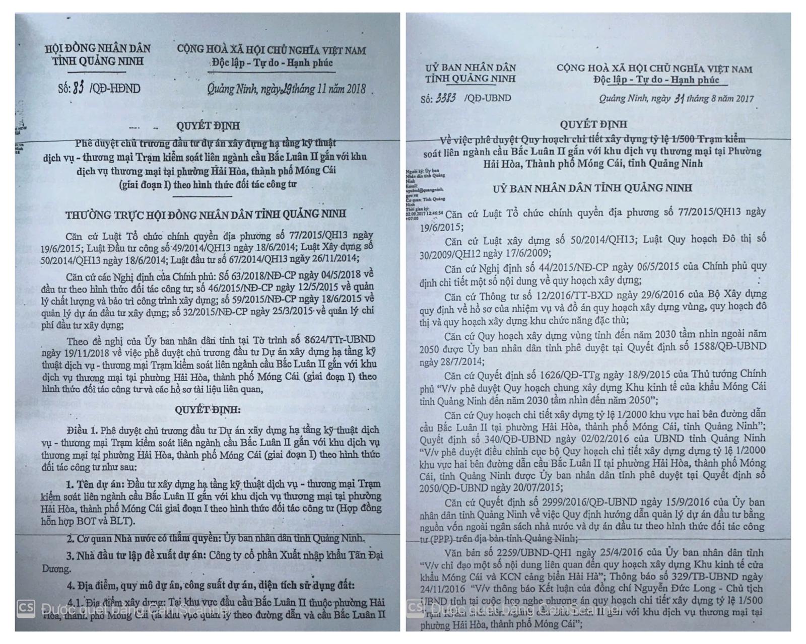 Trao đổi ban đầu với phóng viên Báo Thanh tra, ông Hồ Quang Huy, Chủ tịch UBND TP Móng Cái cho biết: “Sẽ cung cấp thông tin và hồ sơ liên quan về dự án tới lãnh đạo Báo Thanh tra”.