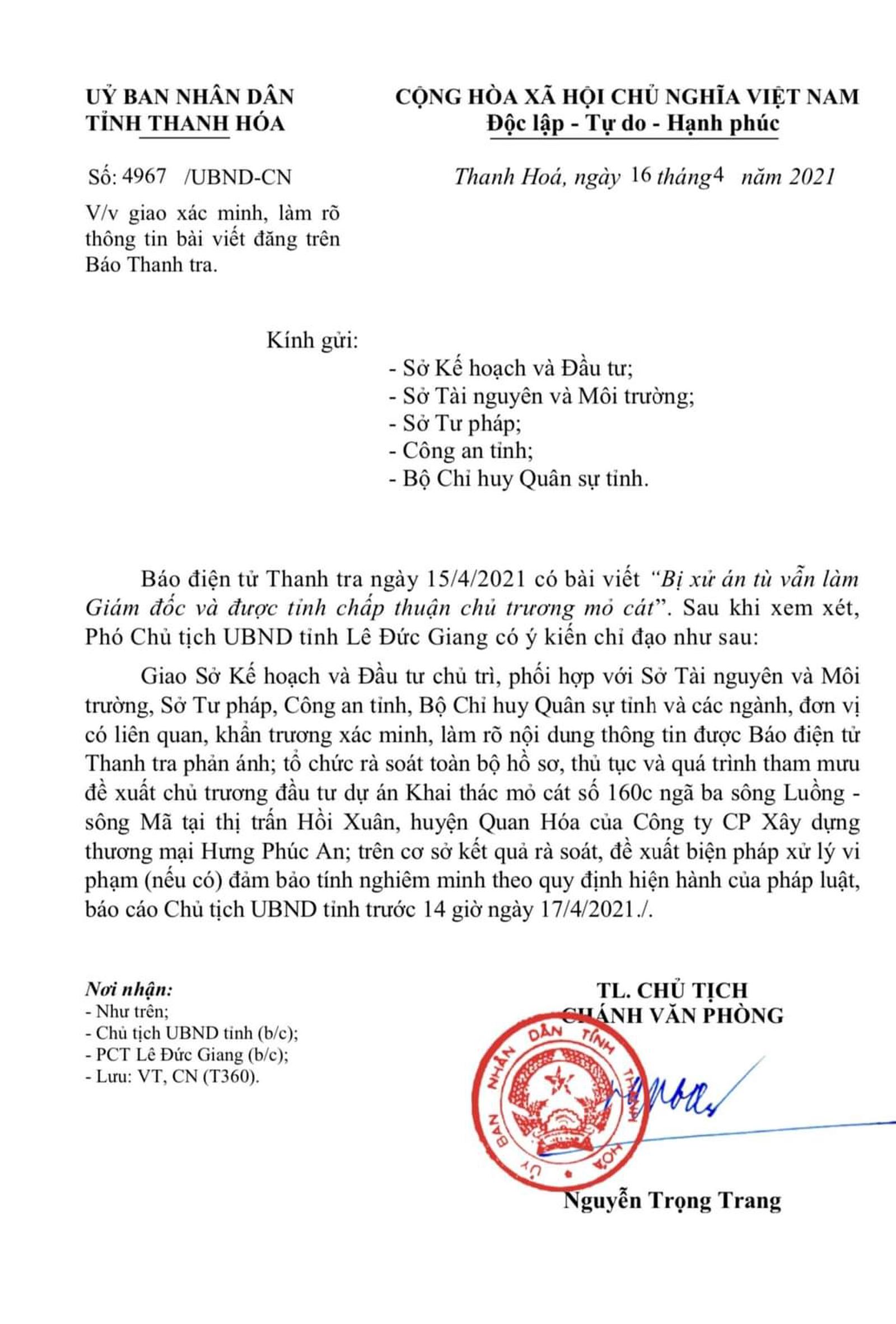 Được biết, sau khi Báo Thanh tra có loạt bài: “Lật lại vụ án tham nhũng ở dự án giao thông xã Mường Chanh, huyện Mường Lát (Thanh Hóa): Trịnh Anh Tuấn chủ mưu lập khống hồ sơ rút tiền nhiều tỷ đồng của Nhà nước”; "Bị xử án tù vẫn làm Giám đốc và được tỉnh chấp thuận chủ trương mỏ cát”, ngày 16/4/2021, UBND tỉnh Thanh Hóa đã có Văn bản số 4967/UBND-CN truyền đạt ý kiến của ông Lê Đức Giang, Phó Chủ tịch UBND tỉnh giao Sở Kế hoạch và Đầu tư làm chủ đầu tư chủ trì phối hợp với Sở Tài nguyên và Môi trường, Sở Tư pháp, Công an tỉnh, Bộ Chỉ huy Quân sự tỉnh và các ngành, đơn vị liên quan khẩn trương, xác minh, làm rõ nội dung Báo Thanh tra điện tử phản ánh. Tổ chức rà soát toàn bộ hồ sơ, thủ tục quá trình tham mưu đề xuất chủ trương đầu tư dự án khai thác mỏ cát số 160C ngã ba sông Luồng – sông Mã tại thị trấn Hồi Xuân, huyện Quan Hóa của Cty Hưng Phúc An. Trên cơ sở kết quả rà soát, đề xuất biện pháp xử lý vi phạm (nếu có), đảm bảo tính nghiêm minh theo quy định hiện hành của pháp luật, báo cáo Chủ tịch UBND tỉnh trước 14 giờ ngày 17/4/2021.