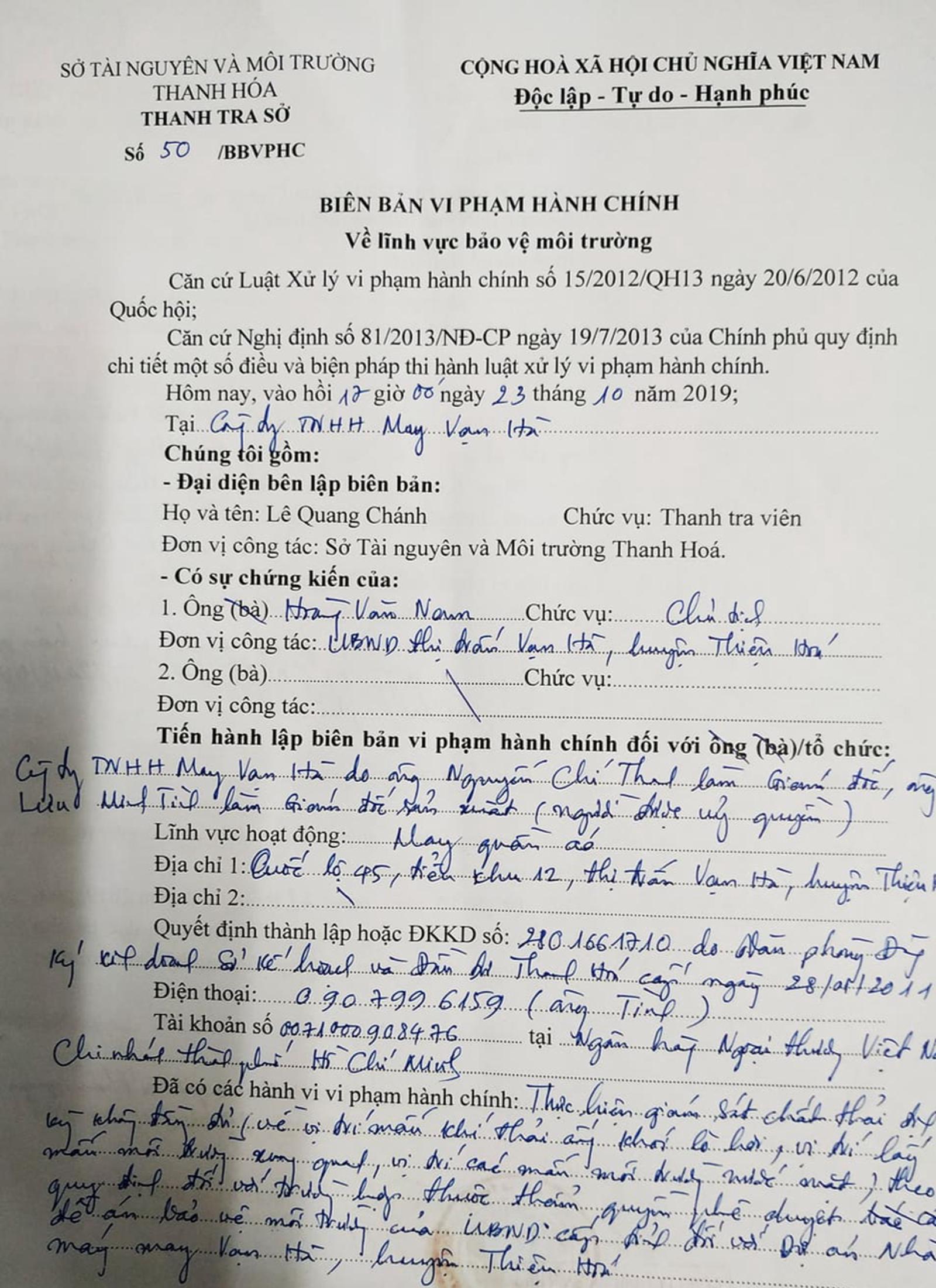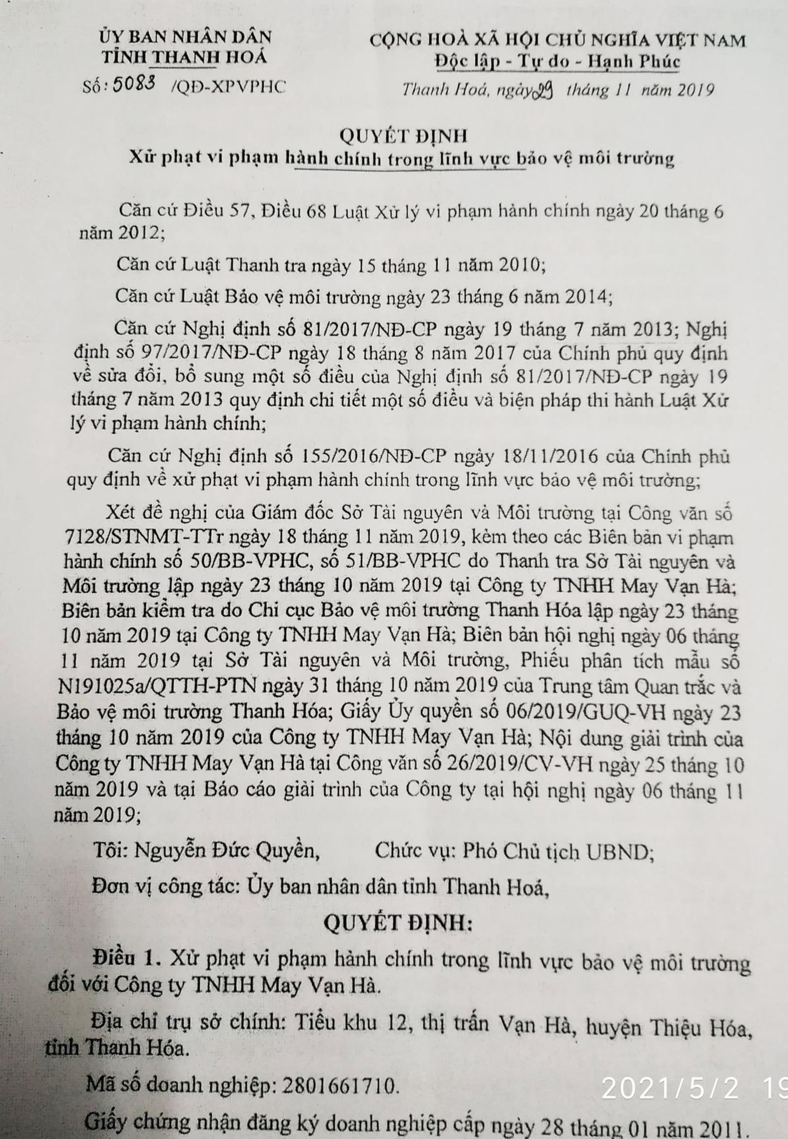 Theo tìm hiểu được biết, vào ngày 29/11/2019, UBND tỉnh Thanh Hóa đã ra Quyết định xử phạt vi phạm hành chính trong lĩnh vực bảo vệ môi trường số 5083/QĐ-XPVPHC đối với Cty TNHH May Vạn Hà.