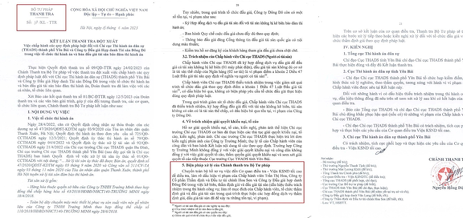 Cụ thể, ngày 15/6/2023, Chánh Thanh tra Bộ Tư pháp Nguyễn Hồng Diện có Thông báo kết luận số 37/KL-TTR thanh tra đột xuất về việc chấp hành các quy định pháp luật đối với Chi cục Thi hành án dân sự (THADS) TP Yên Bái và Công ty Đấu giá Hợp danh tài sản Đông Đô trong việc tổ chức THA và bán đấu giá tài sản bảo đảm THA.