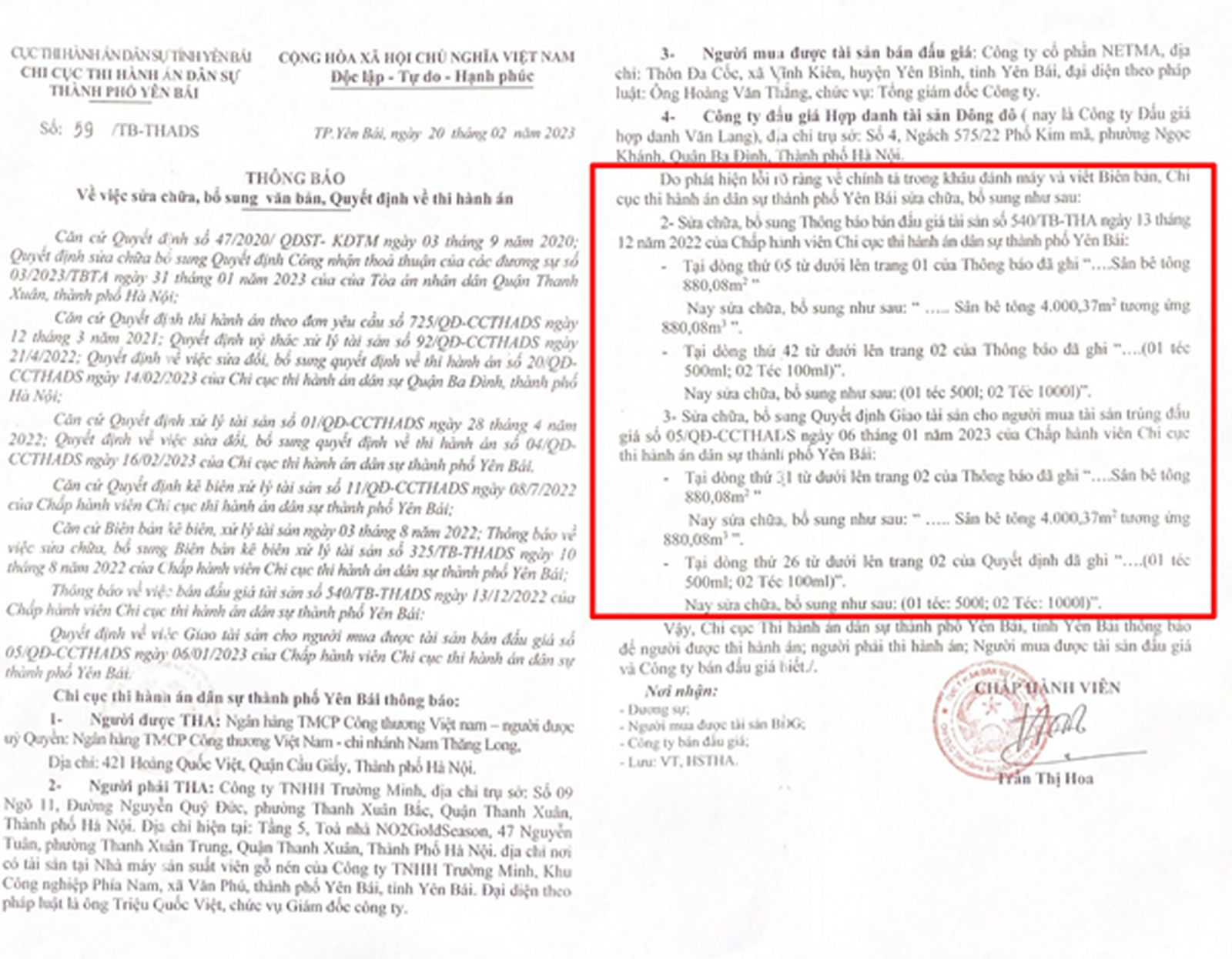 Tại biên bản kê biên ngày 3/8/2022, chấp hành viên Trần Thị Hoa đã lập biên bản trước sự chứng kiến của đại diện đầy đủ các cơ quan chức năng có thẩm quyền. Tuy nhiên, khi phát hiện sai sót về số giấy chứng nhận quyền sử dụng đất, diện tích nhà xưởng, diện tích sân trước nhà điều hành, máy biến áp… chấp hành viên tự ý đơn phương ban hành Thông báo sửa chữa, bổ sung biên bản kê biên số 325/TB-THADS ngày 10/8/2022. “Đây là việc làm tuỳ tiện, ảnh hưởng đến giá trị pháp lý của biên bản cưỡng chế kê biên THA”, kết luận của Thanh tra Bộ Tư pháp nhấn mạnh.