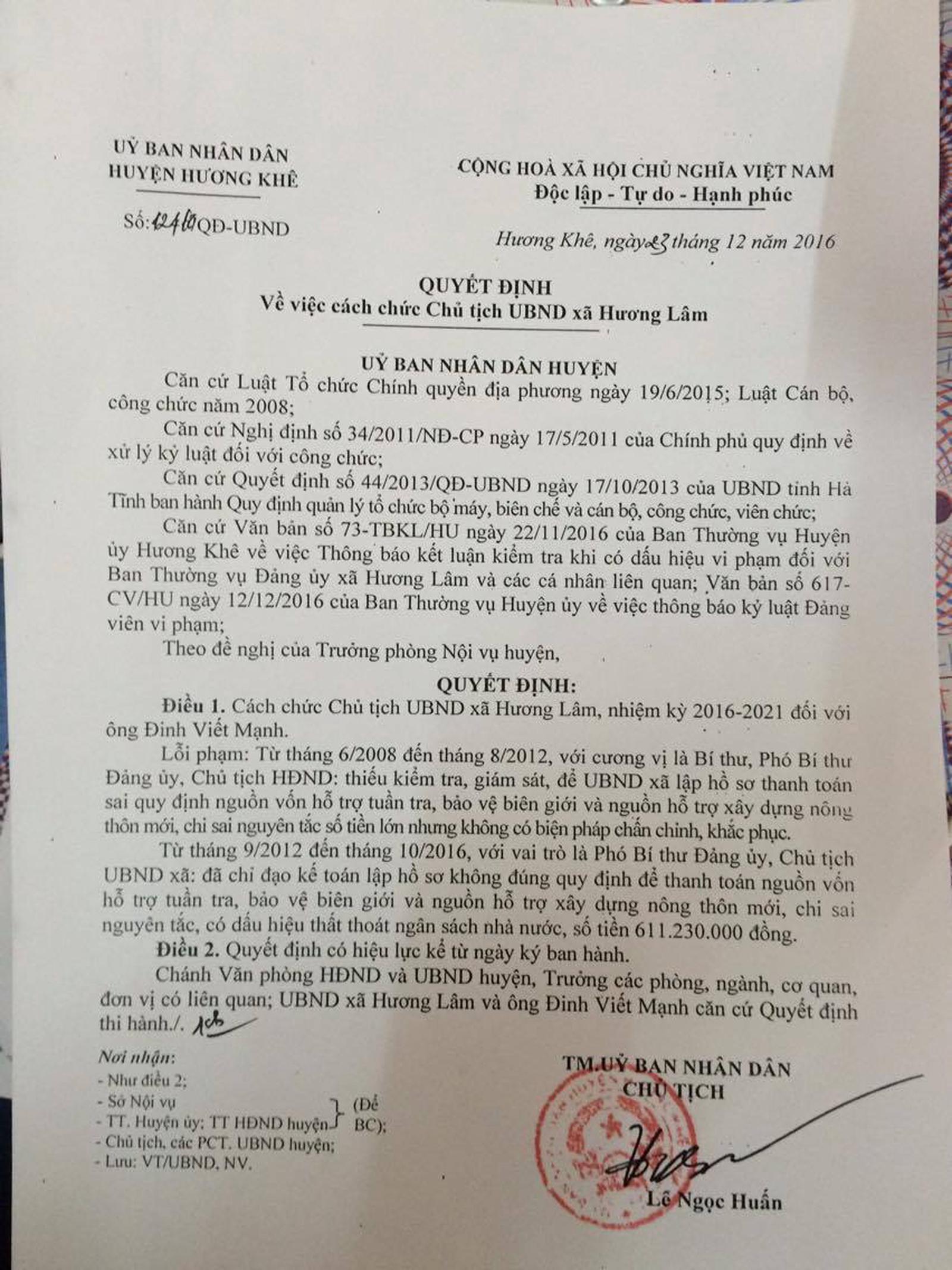 Quyết định cách chức Chủ tịch UBND xã Hương Lâm. Ảnh: HY